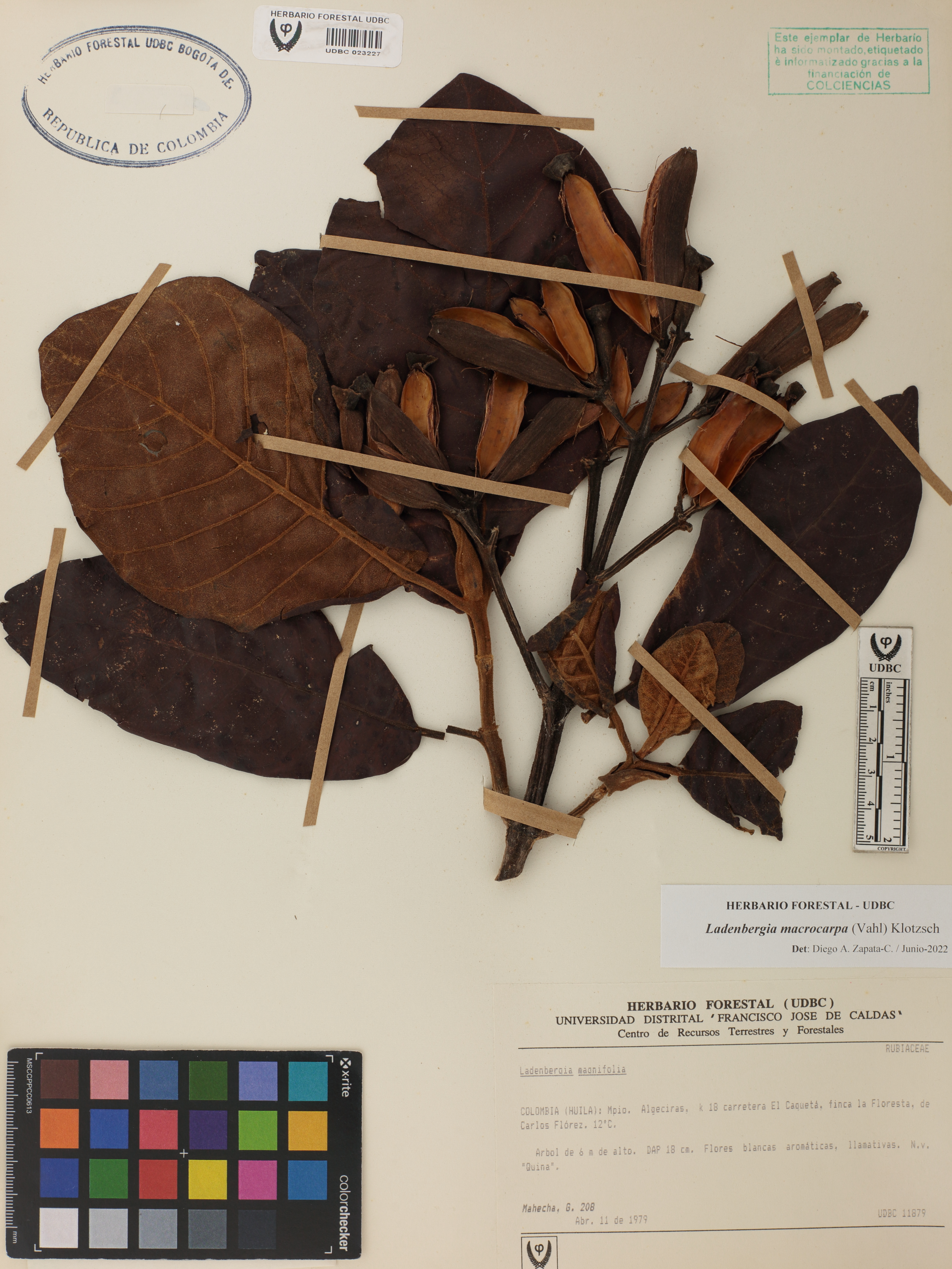 Fotografía del ejemplar Mahecha, G. 208, determinado como Ladenbergia macrocarpa en el año 2022