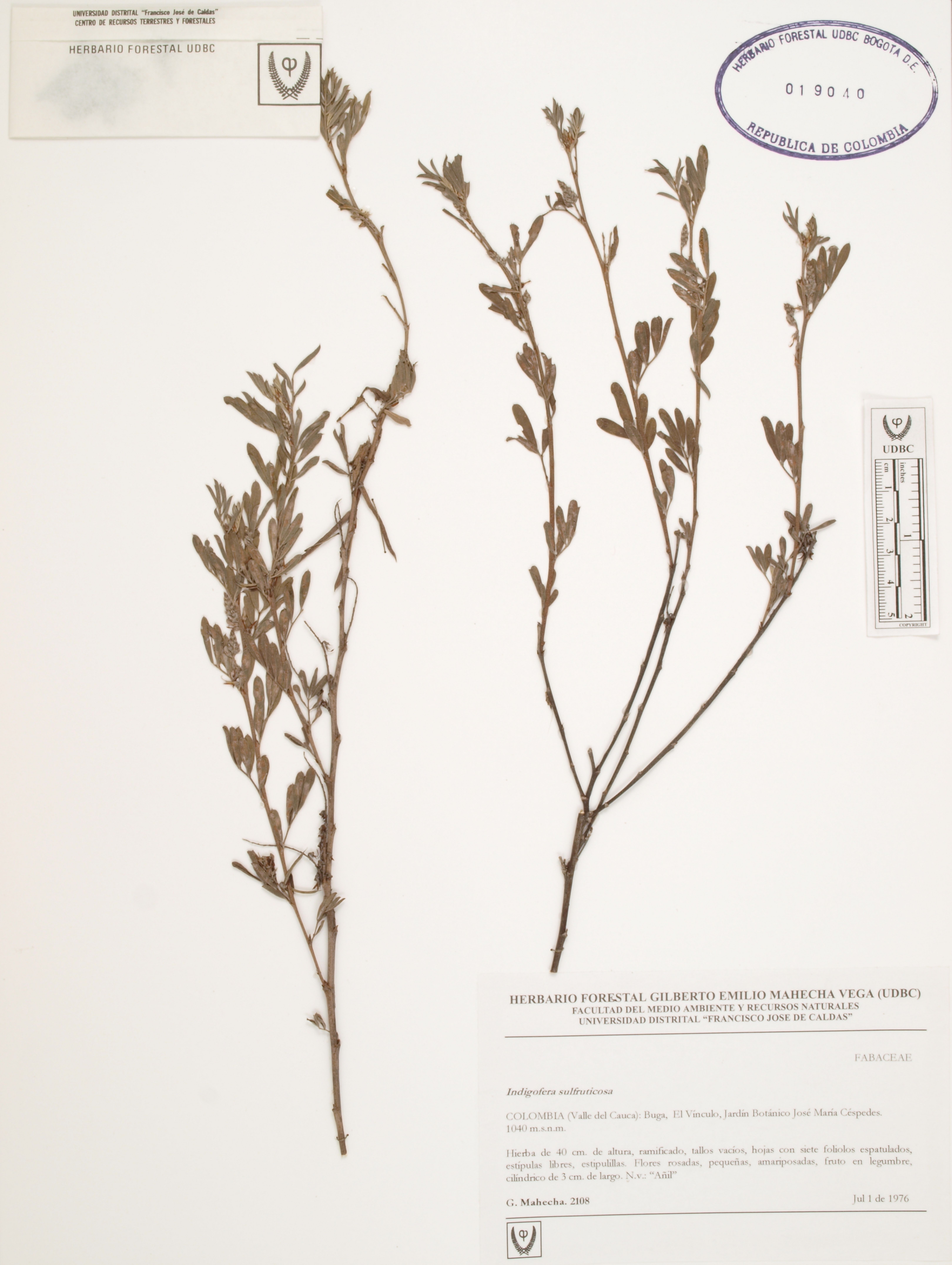 Fotografía del ejemplar Mahecha, G. 2108, determinado como Indigofera suffruticosa