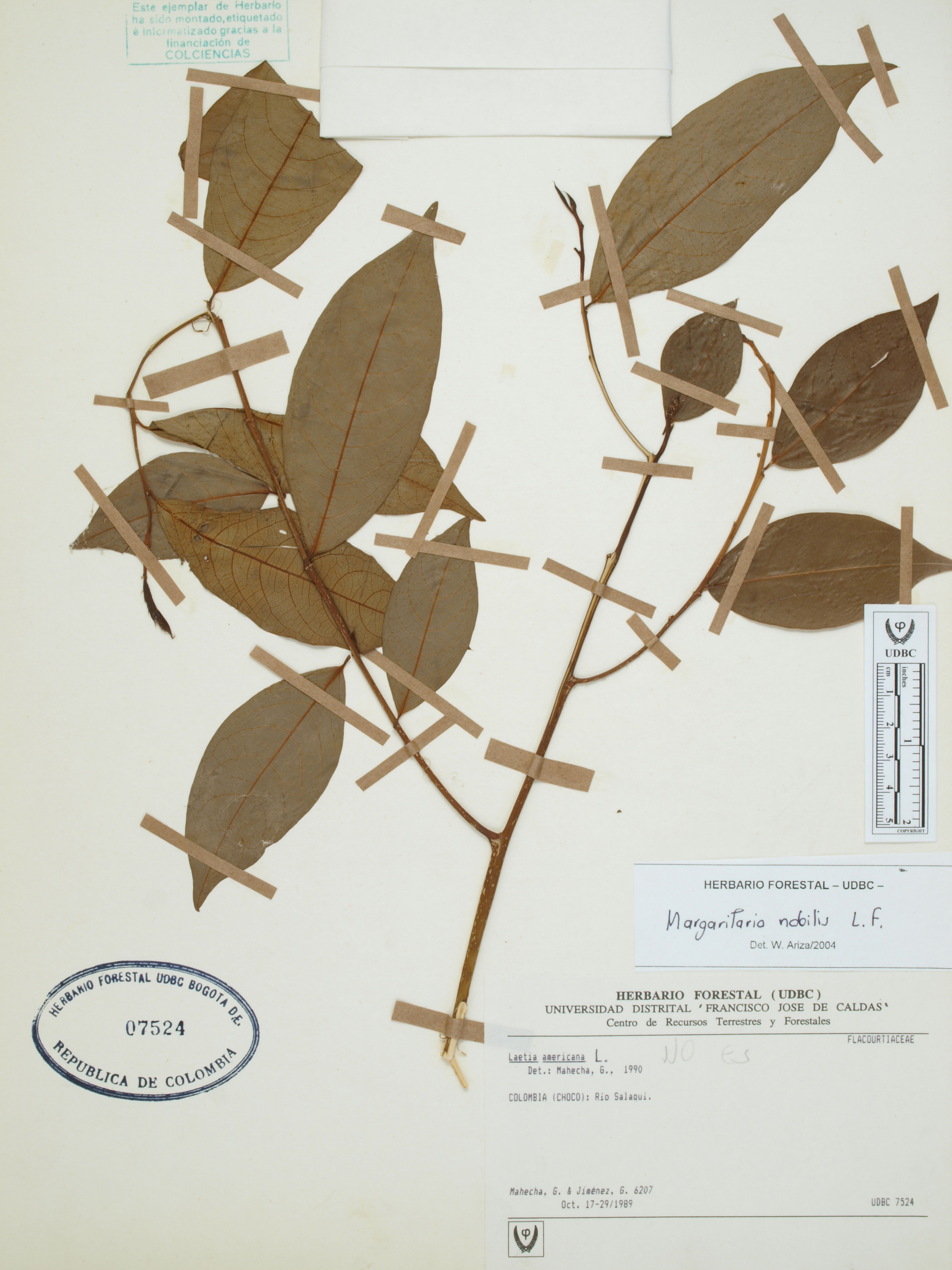 Fotografía del ejemplar Mahecha, G. 6207, determinado como Margaritaria nobilis en el año 1990