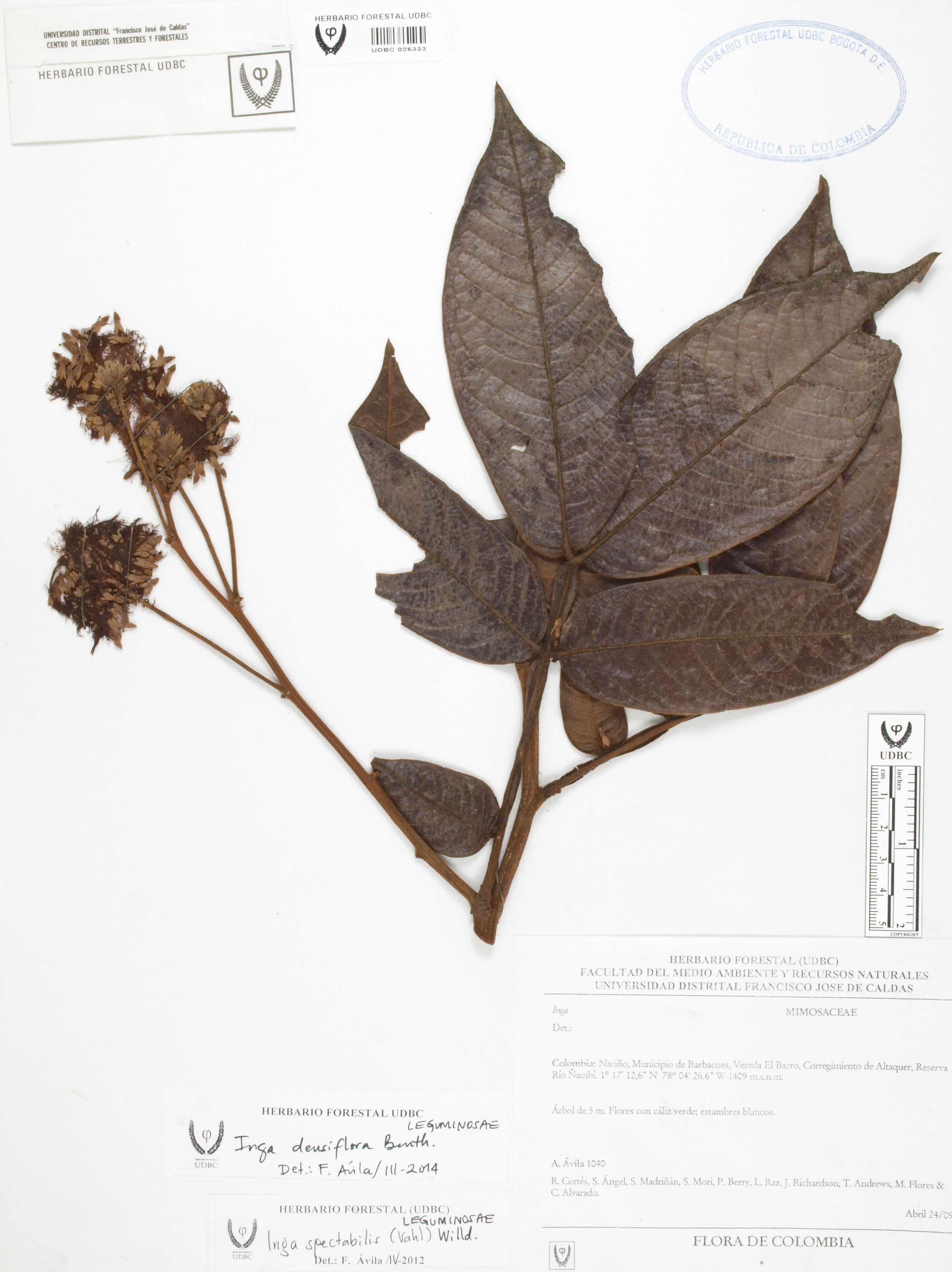 Fotografía del ejemplar Ávila, F. 1040, determinado como Inga densiflora
