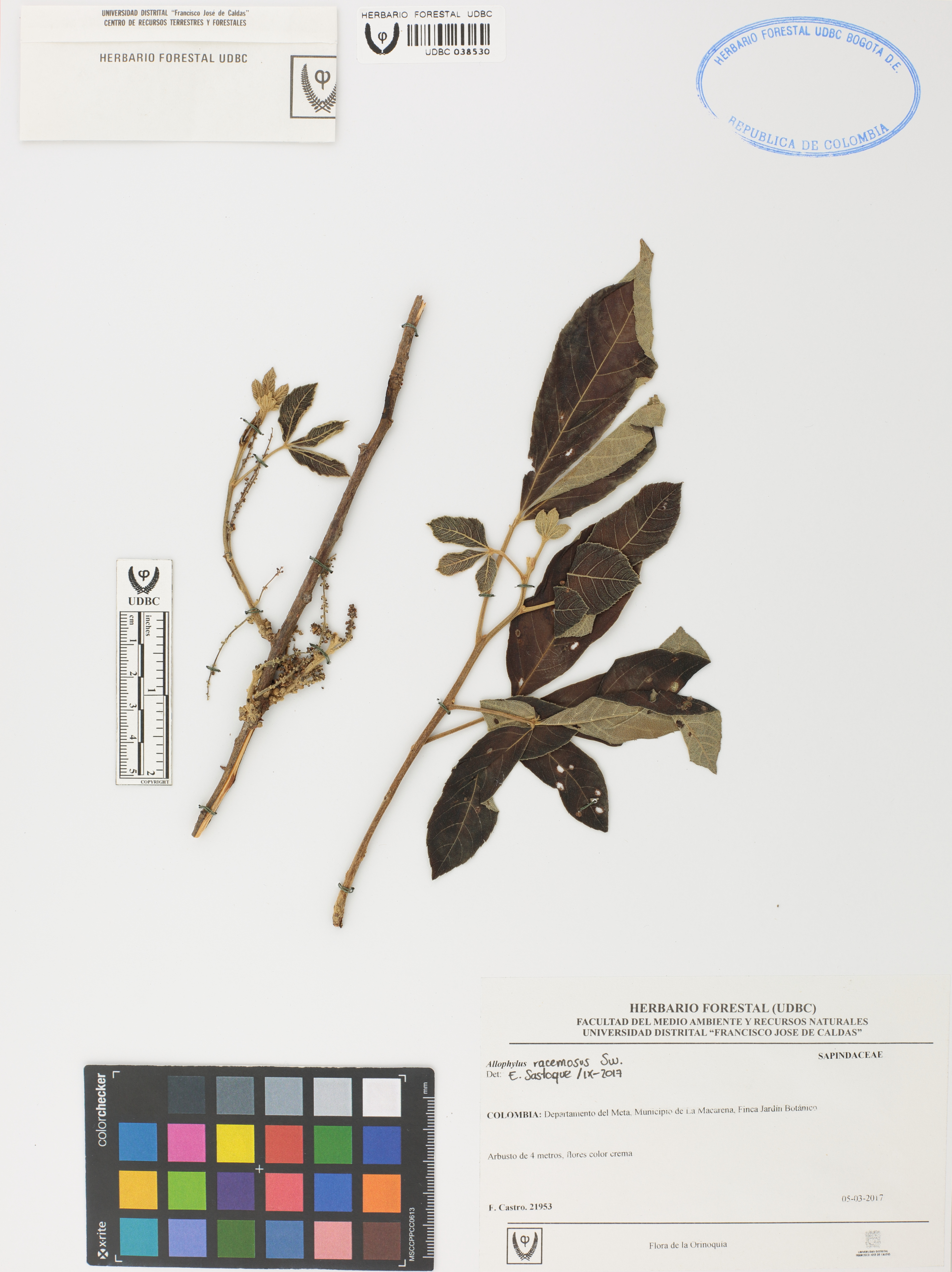 Fotografía del ejemplar Castro, F. 21953, determinado como Allophylus racemosus en el año 2017