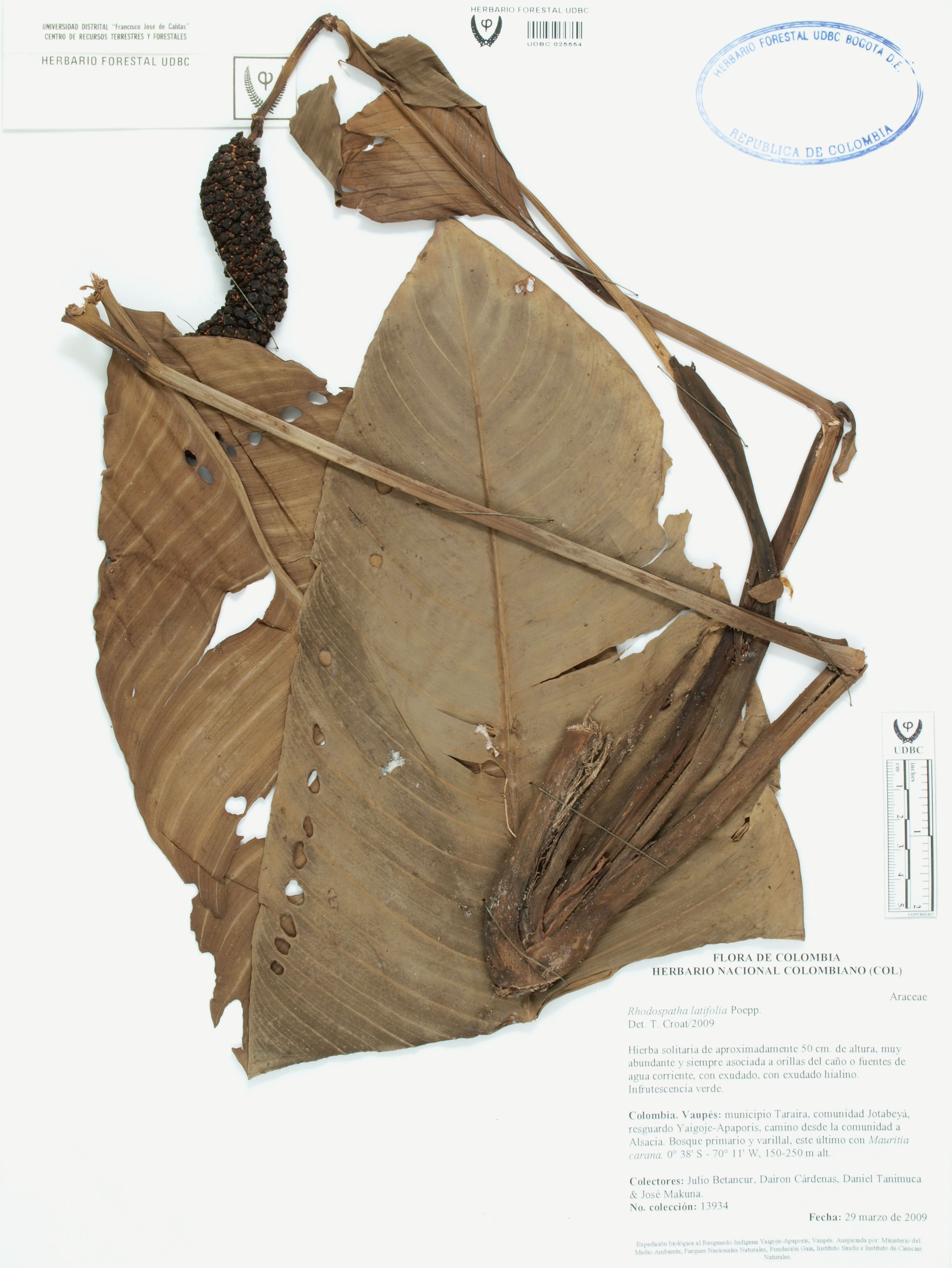 Fotografía del ejemplar Betancur, J. 13934, determinado como Rhodospatha latifolia en el año 2009