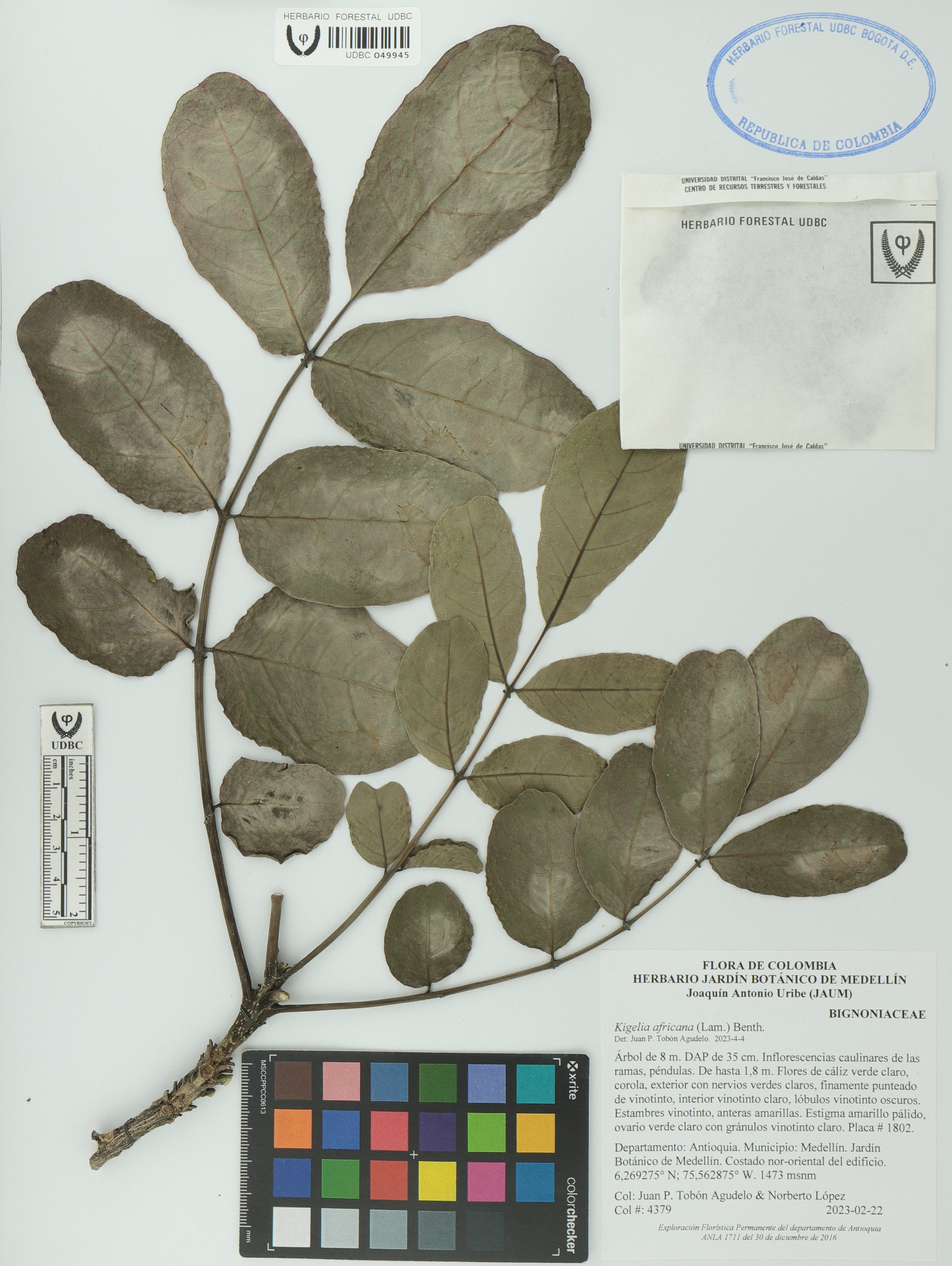 Fotografía del ejemplar Tobón-Agudelo, J. 4379, determinado como Kigelia africana en el año 2023