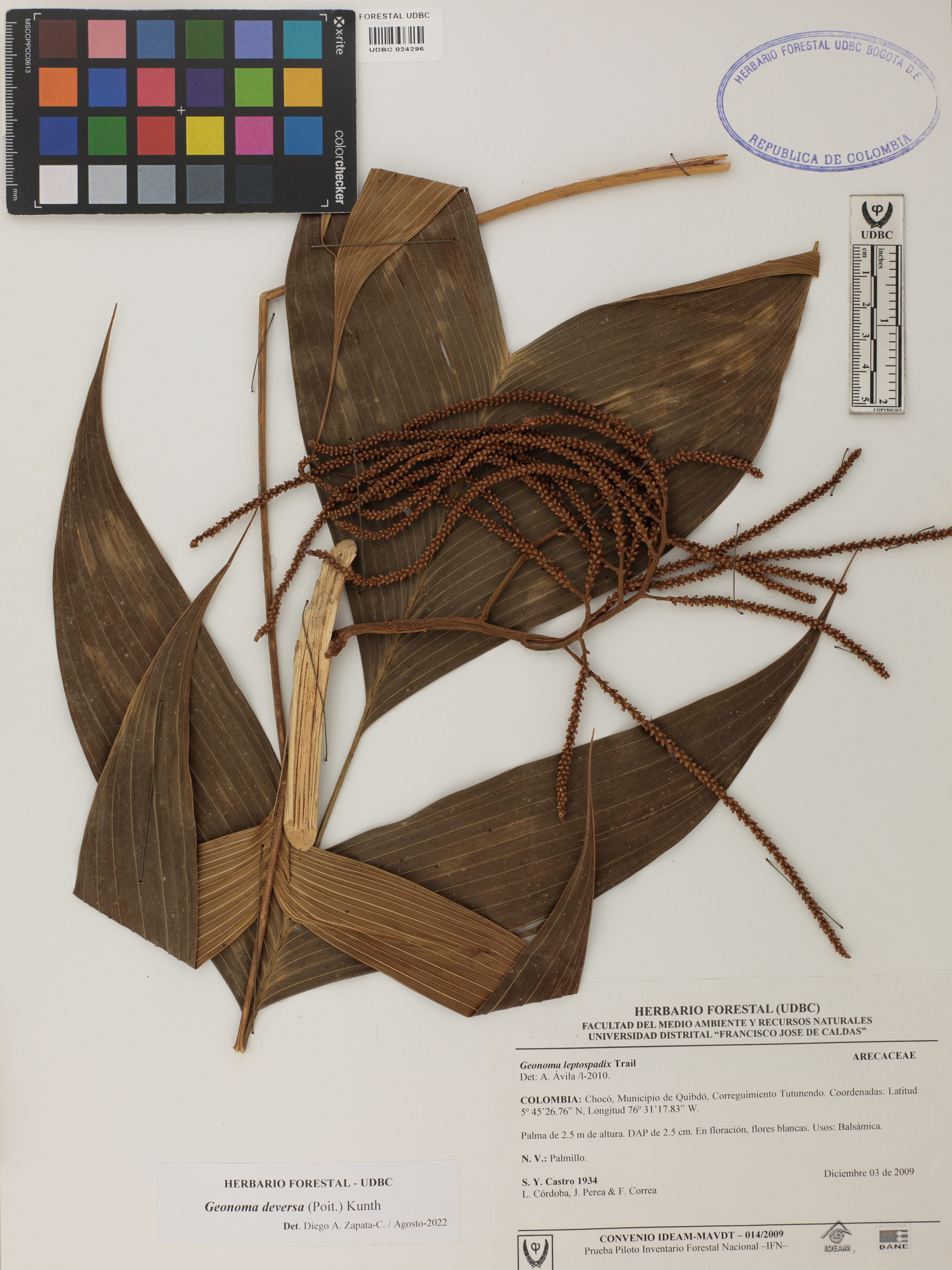 Fotografía del ejemplar Castro, S. 1934, determinado como Geonoma deversa en el año 2022