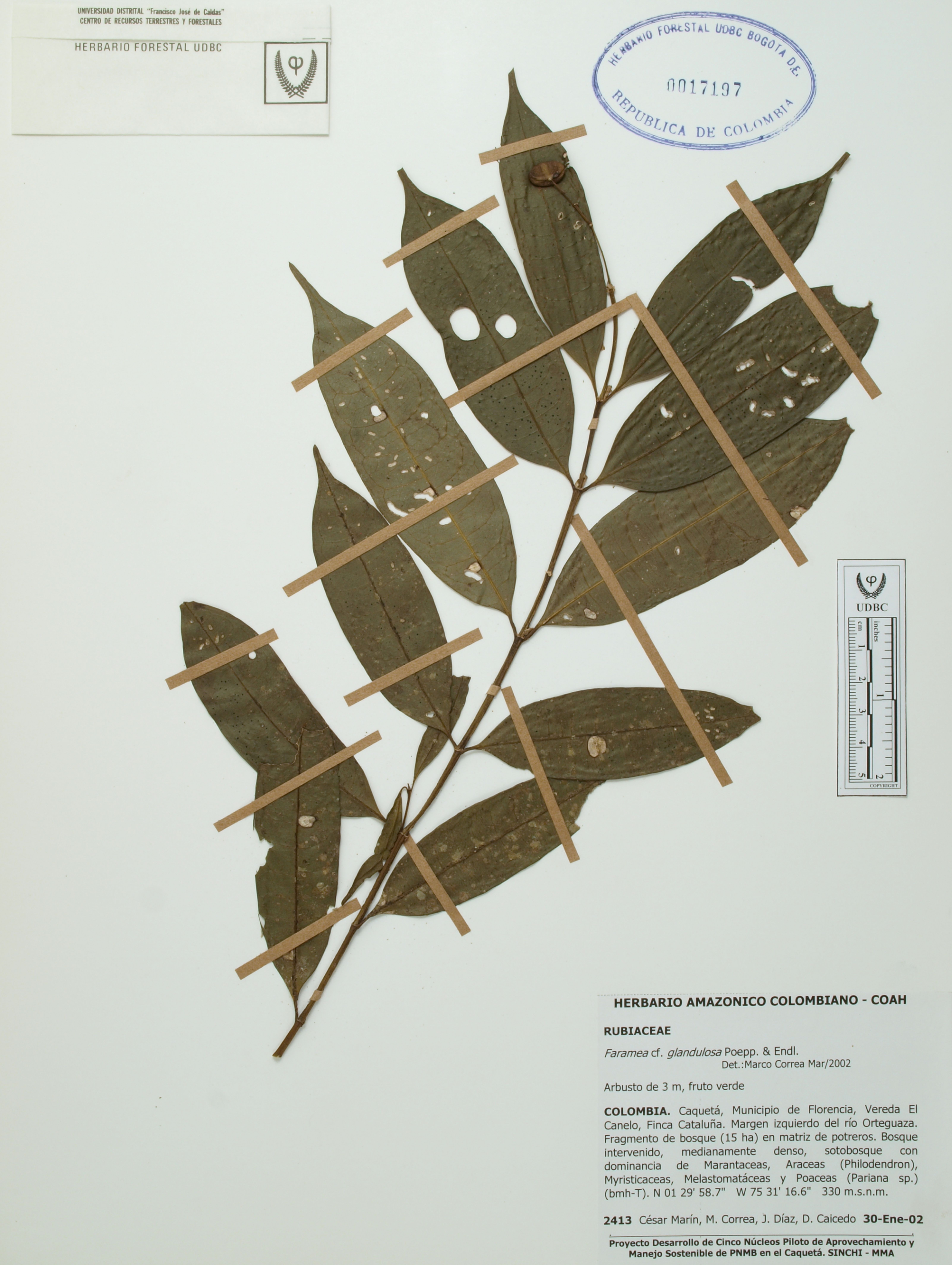 Fotografía del ejemplar Marín, C. 2413, determinado como Faramea glandulosa en el año 2002