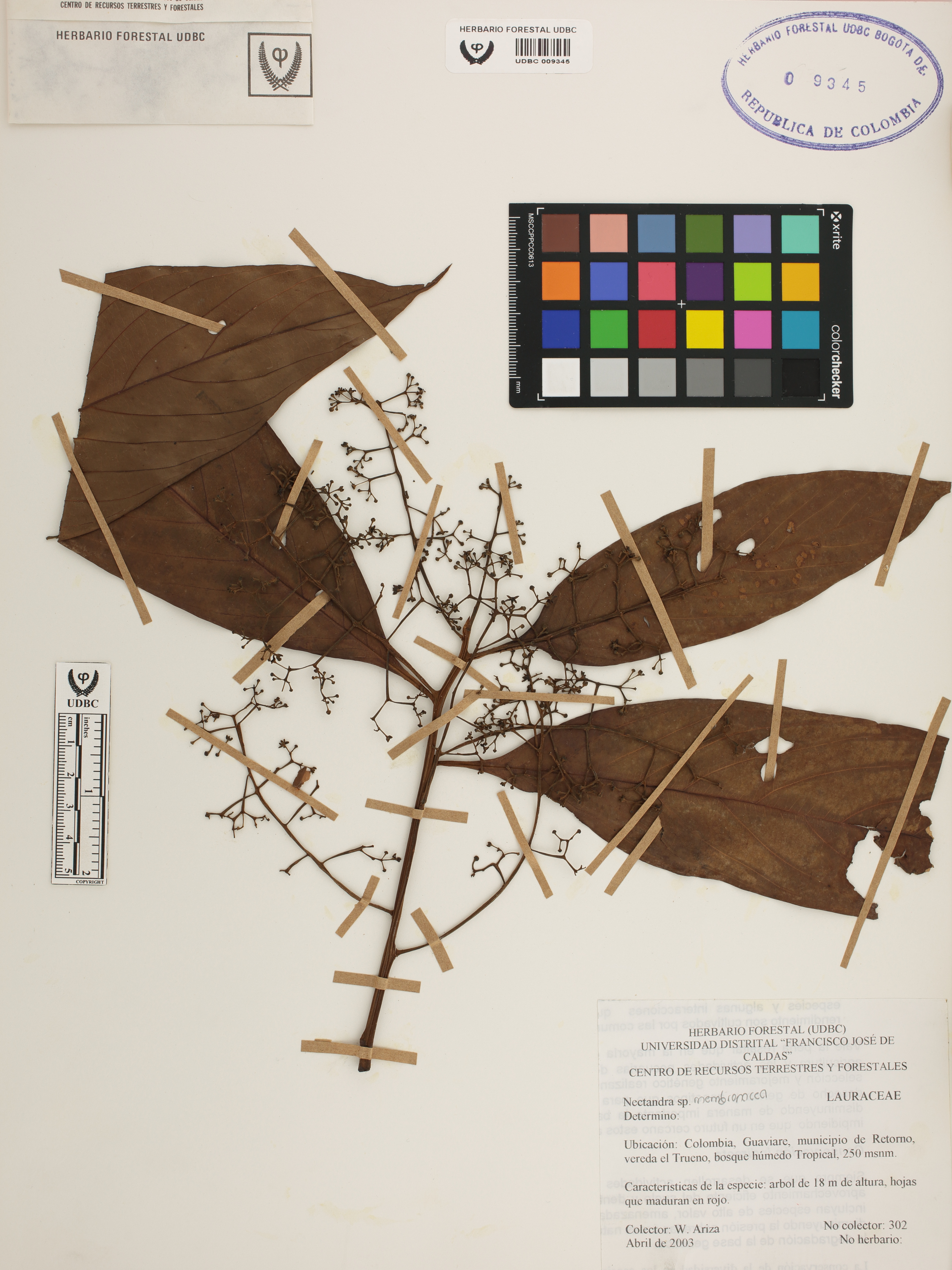 Fotografía del ejemplar Ariza, W. 302, determinado como Nectandra membranacea