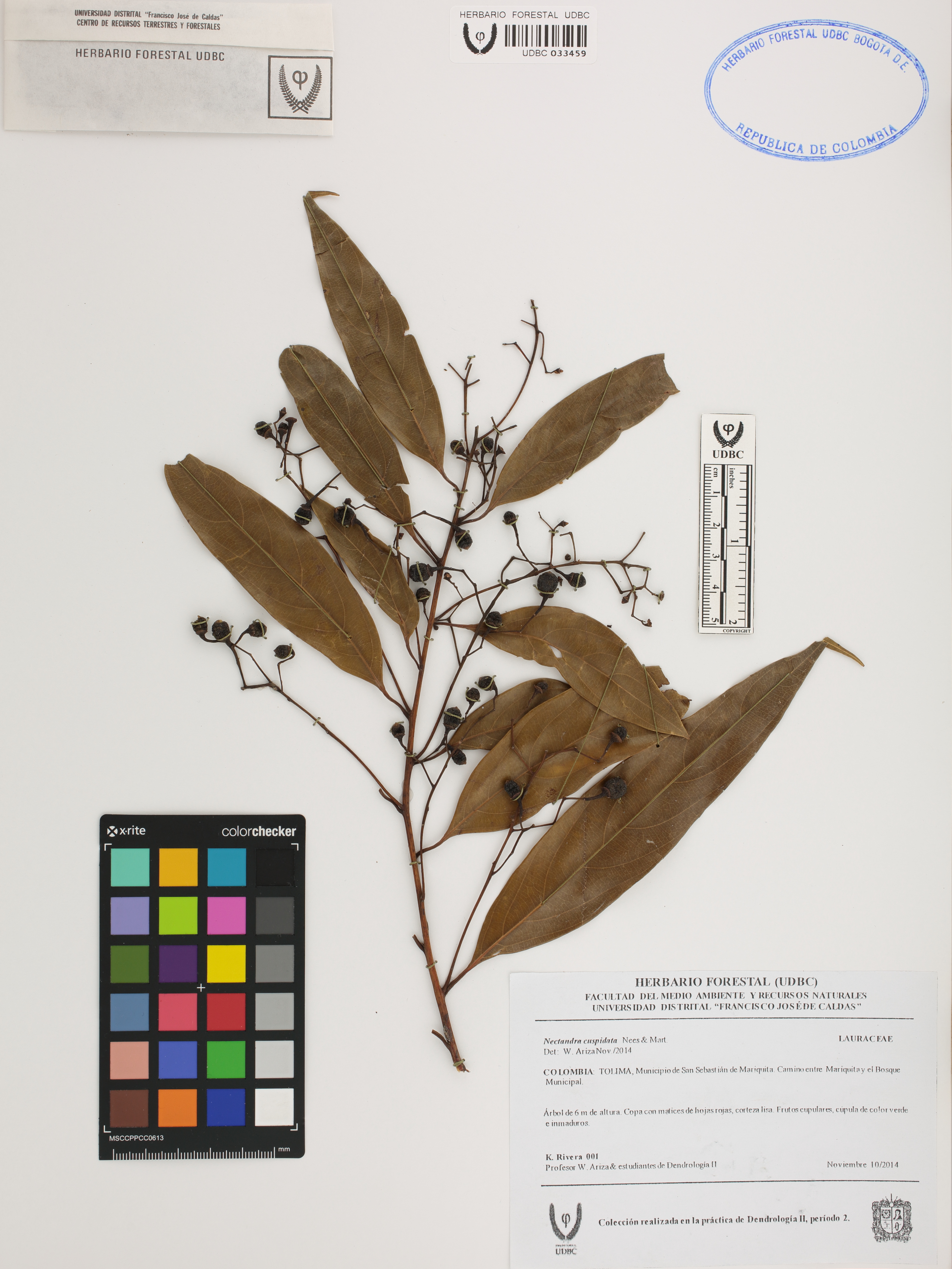 Fotografía del ejemplar Rivera, K. 1, determinado como Nectandra cuspidata en el año 2014