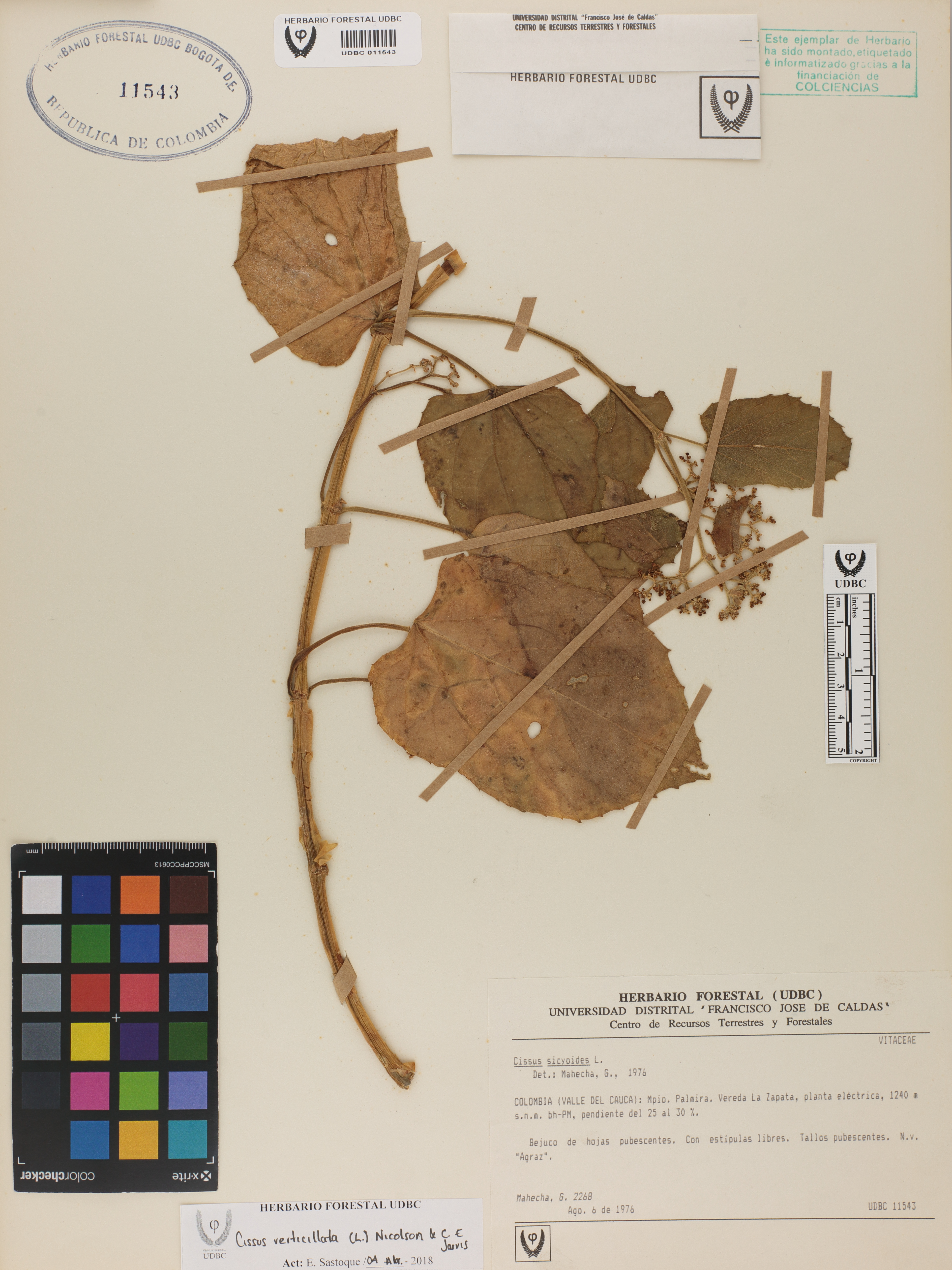 Fotografía del ejemplar Mahecha, G. 2268, determinado como Cissus verticillata en el año 1976