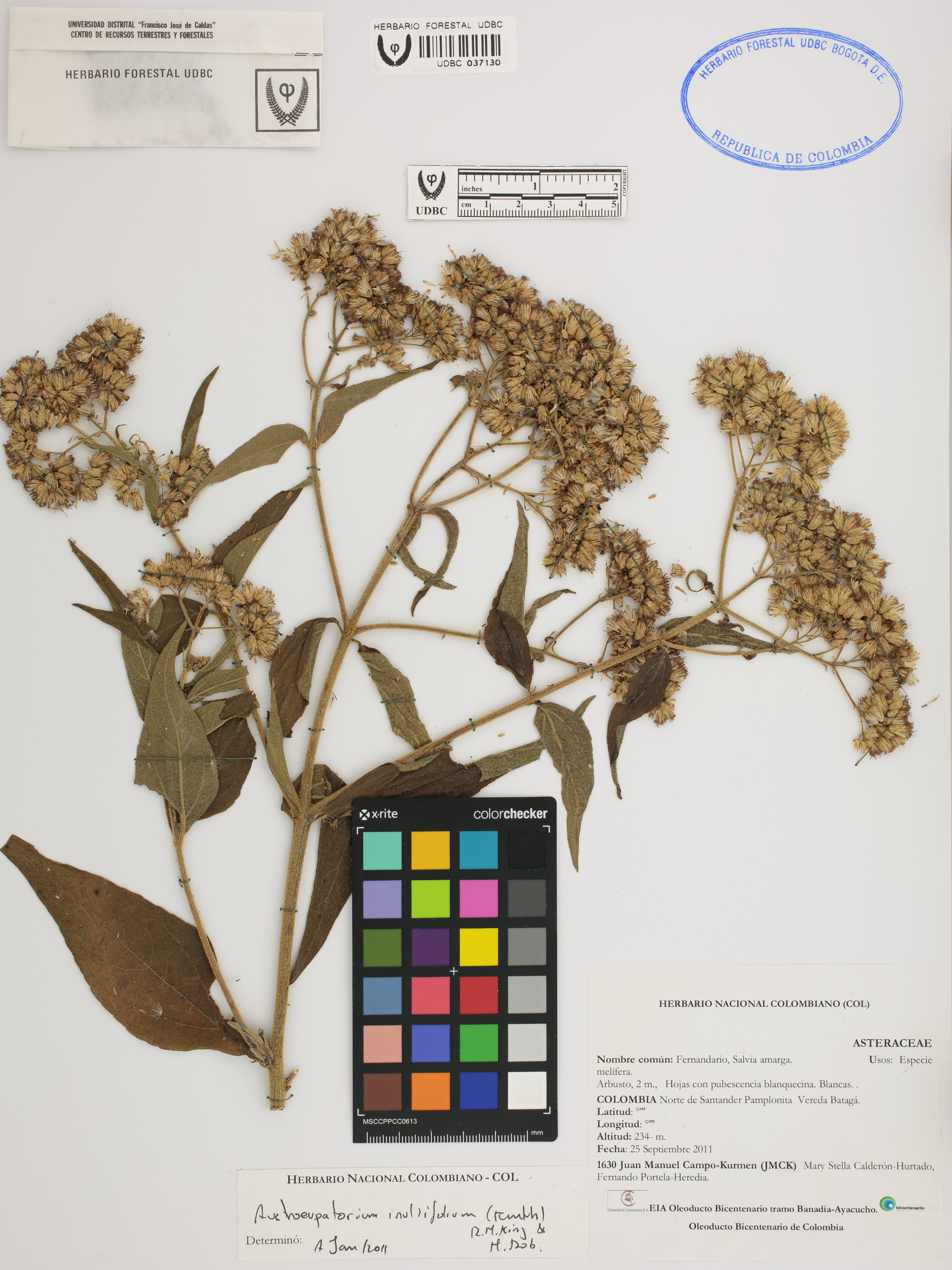 Fotografía del ejemplar Campos-Kurmen, J. 1630, determinado como Austroeupatorium inulifolium en el año 2011