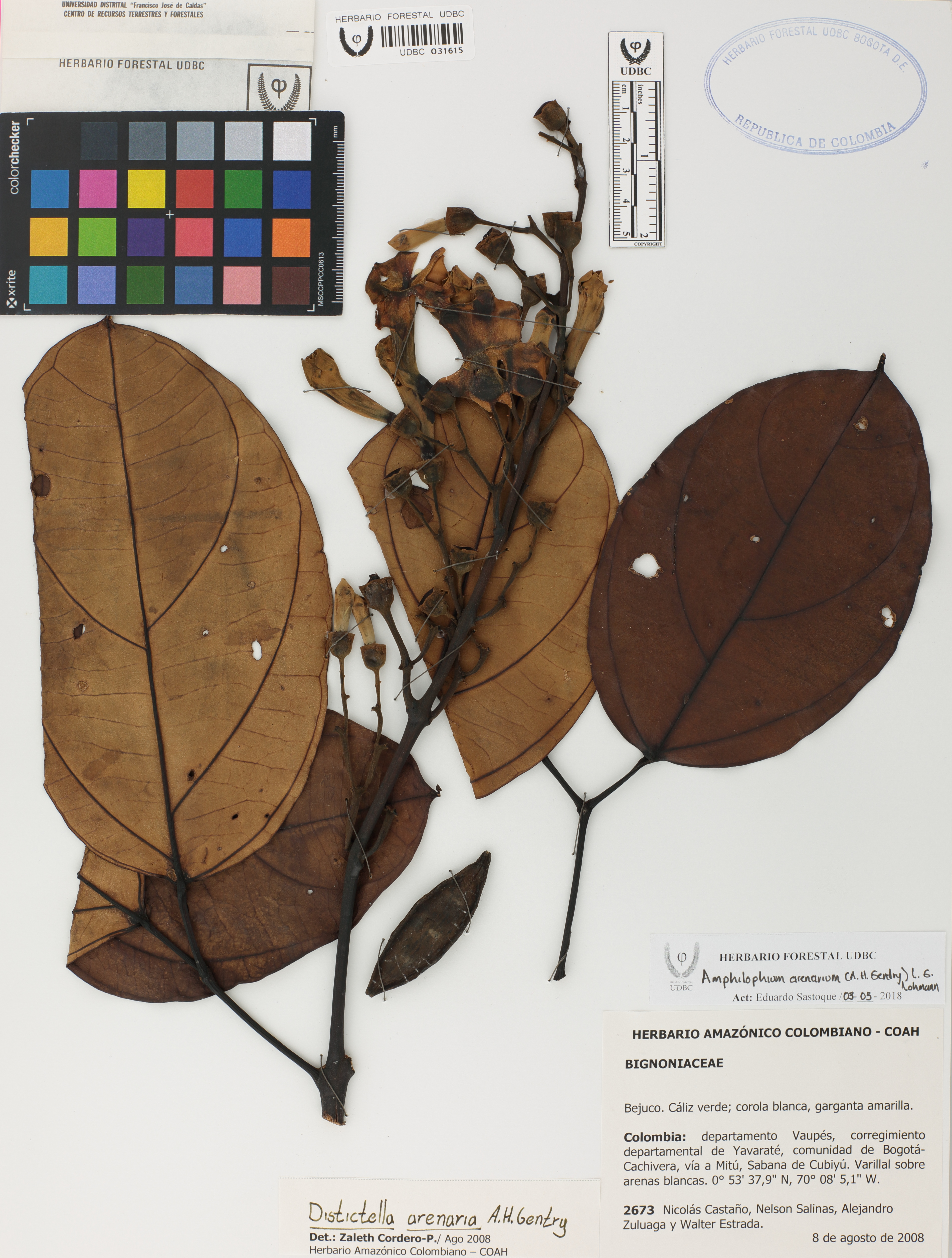 Fotografía del ejemplar Castaño, N. 2673, determinado como Amphilophium arenarium en el año 2008