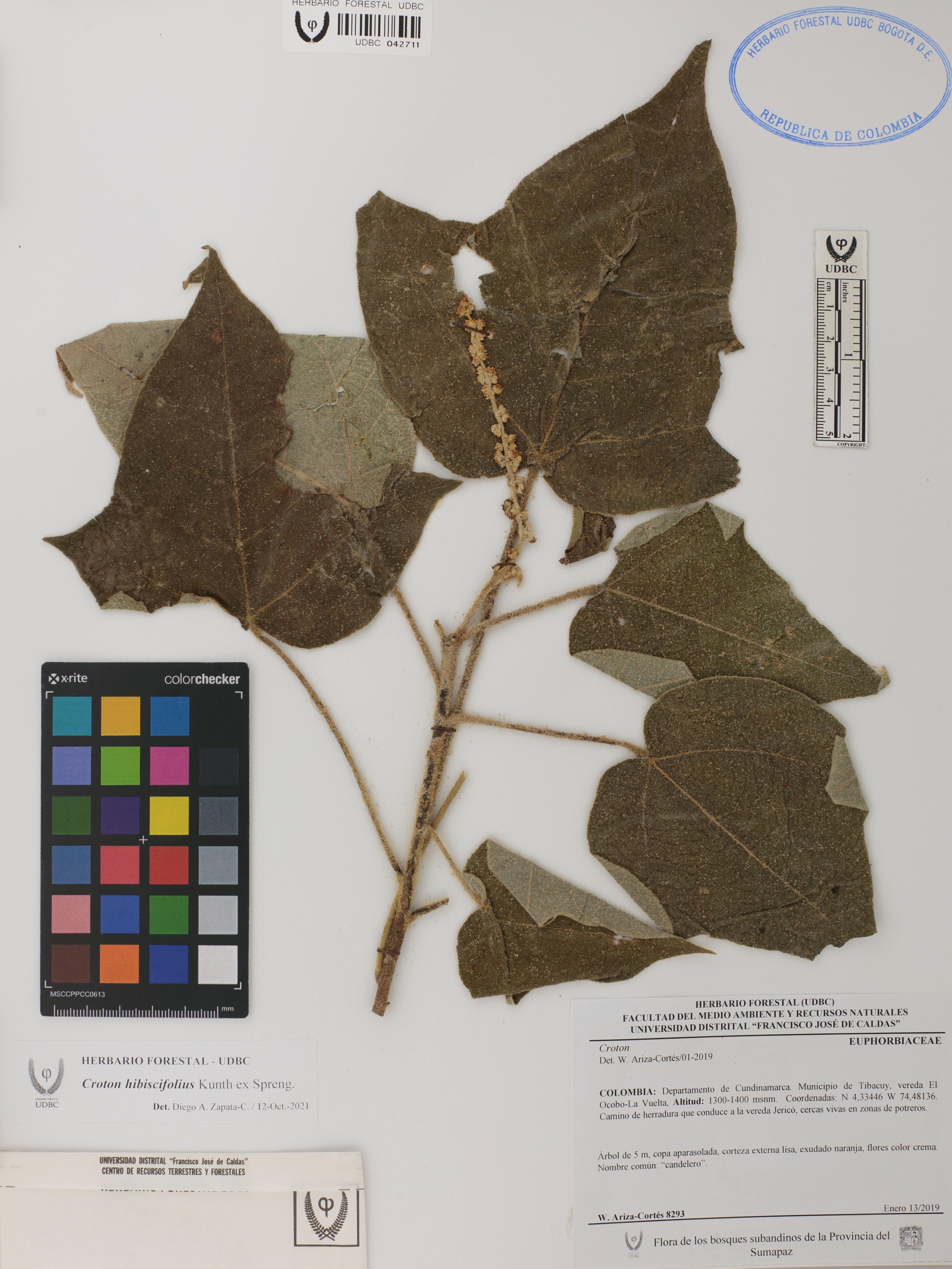 Fotografía del ejemplar Ariza-C., W. 8293, determinado como Croton hibiscifolius en el año 2021