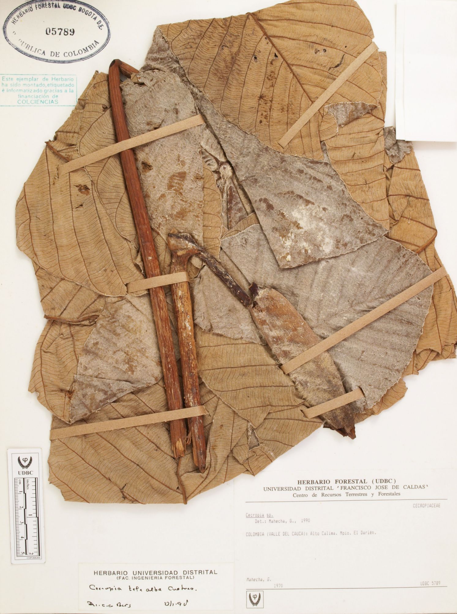 Fotografía del ejemplar Mahecha, G., determinado como Cecropia telealba en el año 1997