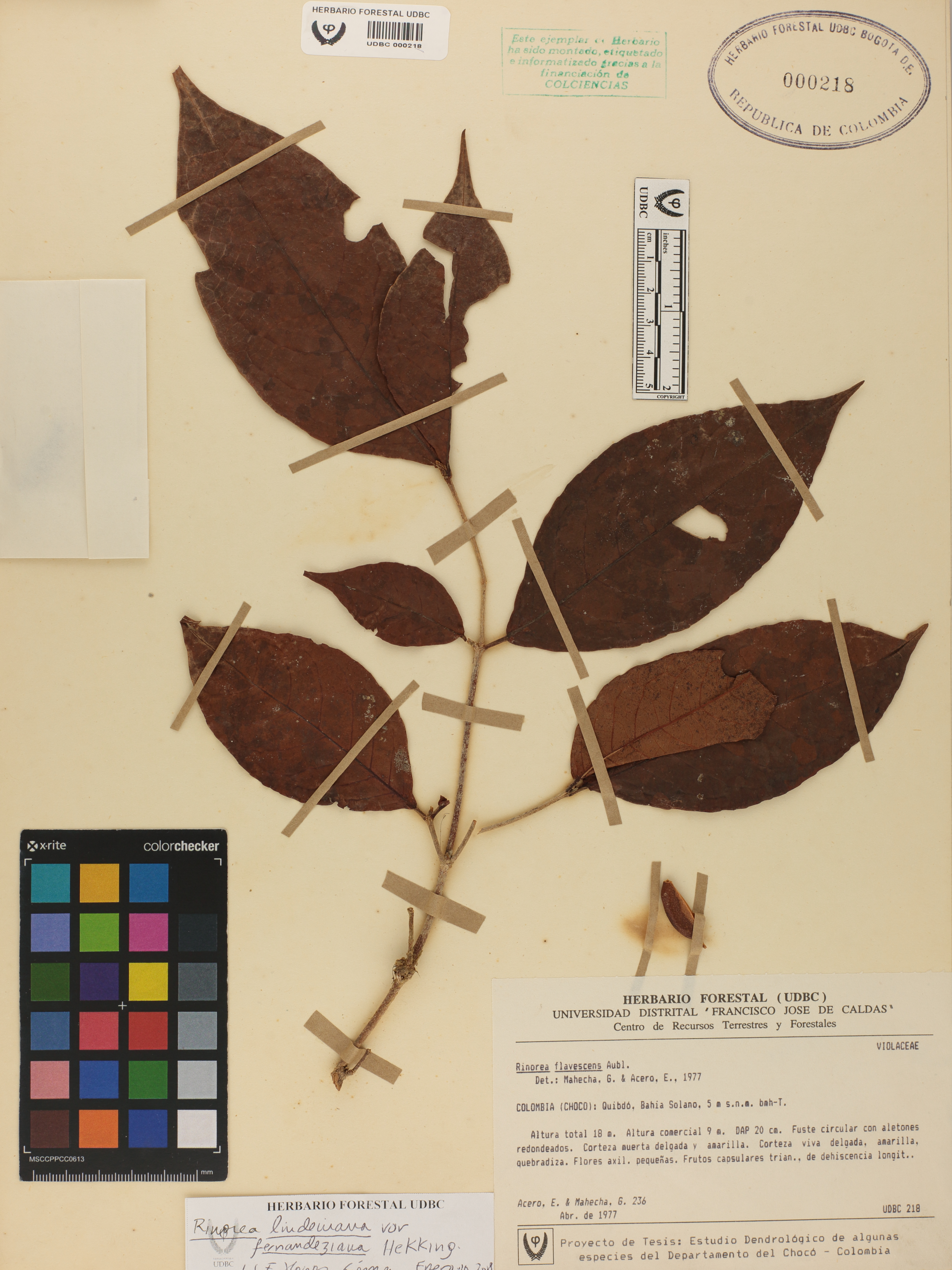 Fotografía del ejemplar Acero, E. 236, determinado como Rinorea lindeniana var. fernandeziana en el año 2019