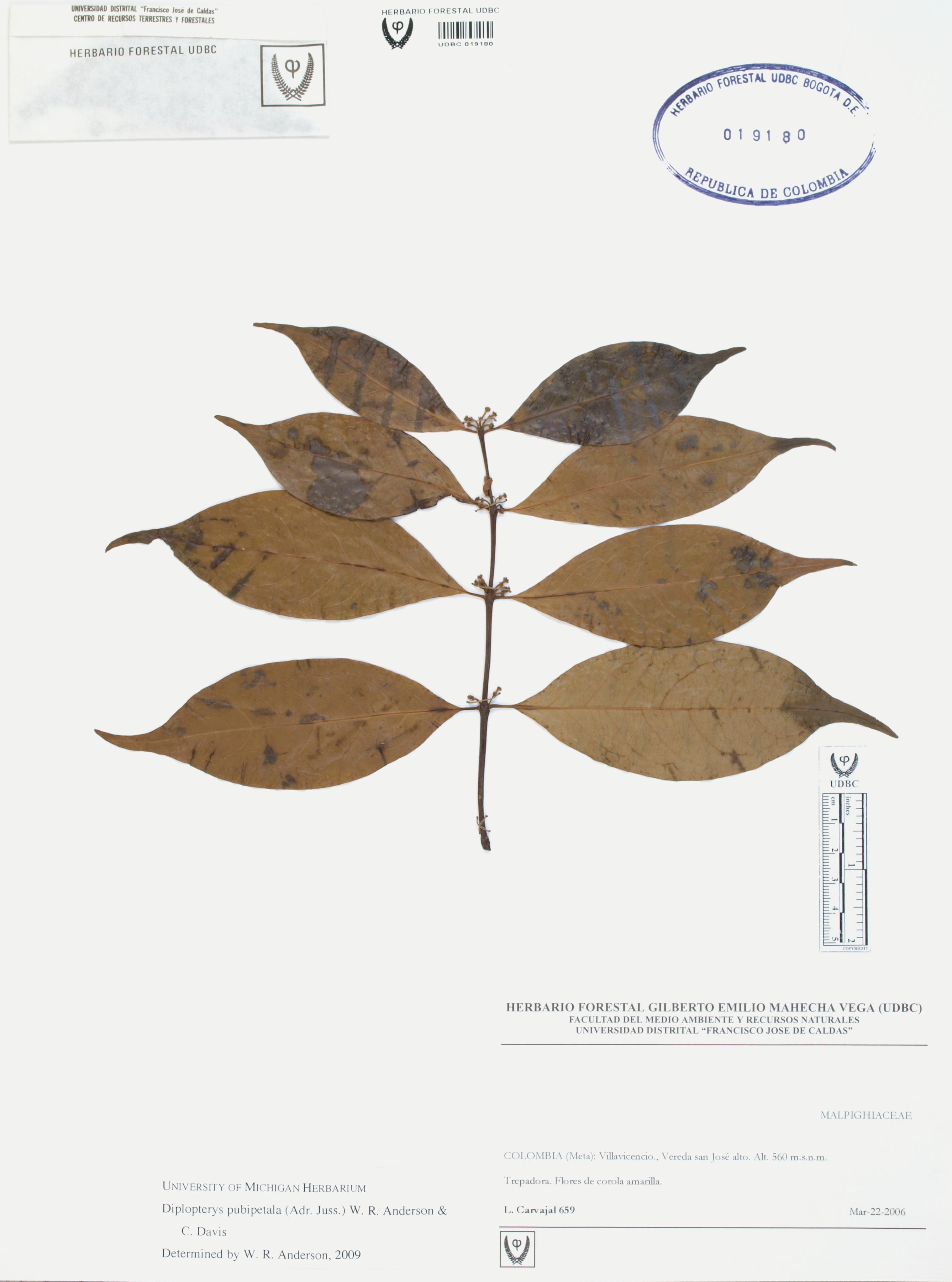 Fotografía del ejemplar Carvajal, L. 659, determinado como Diplopterys pubipetala en el año 2009