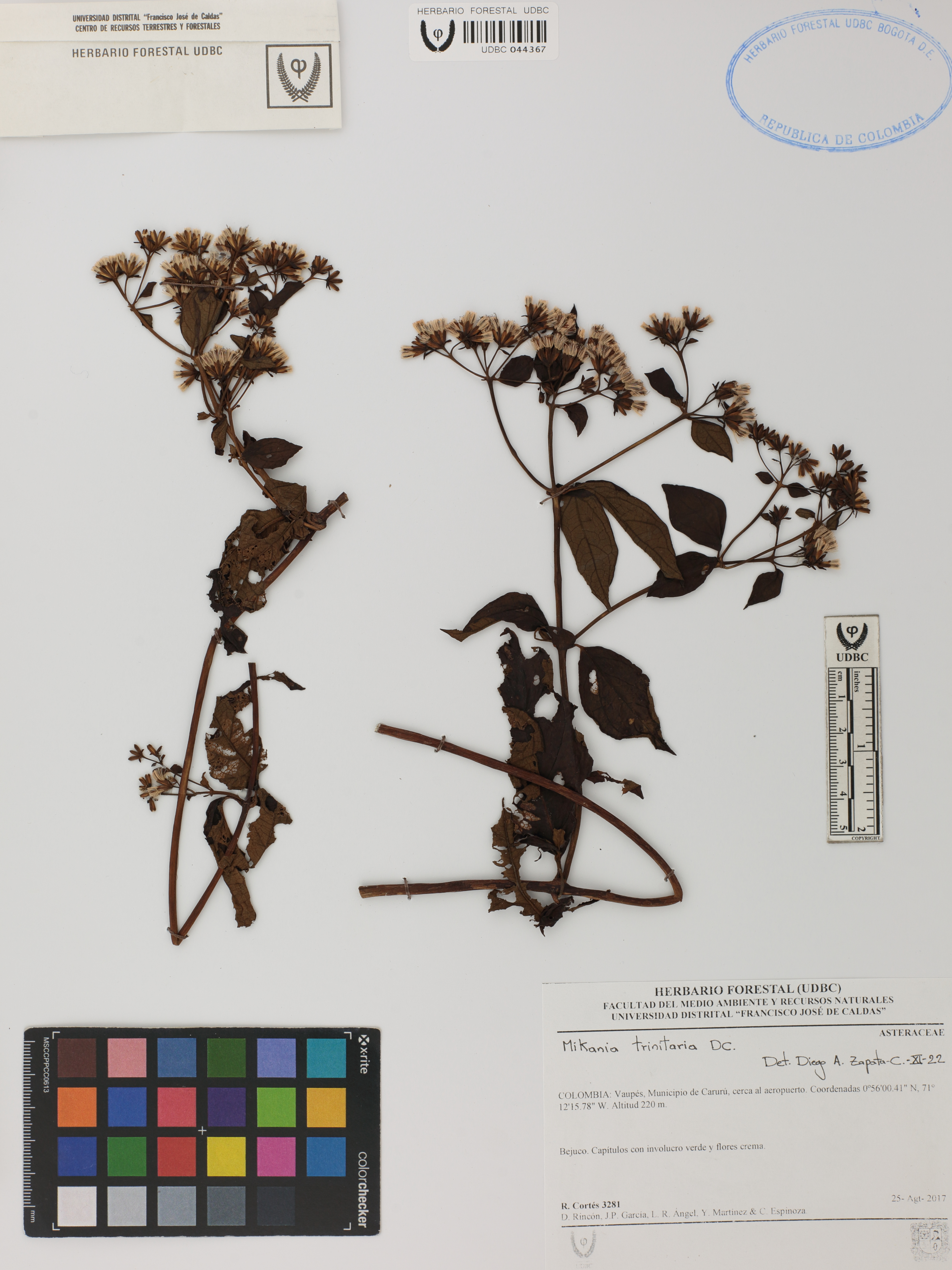 Fotografía del ejemplar Cortés, R. 3281, determinado como Mikania trinitaria en el año 2022
