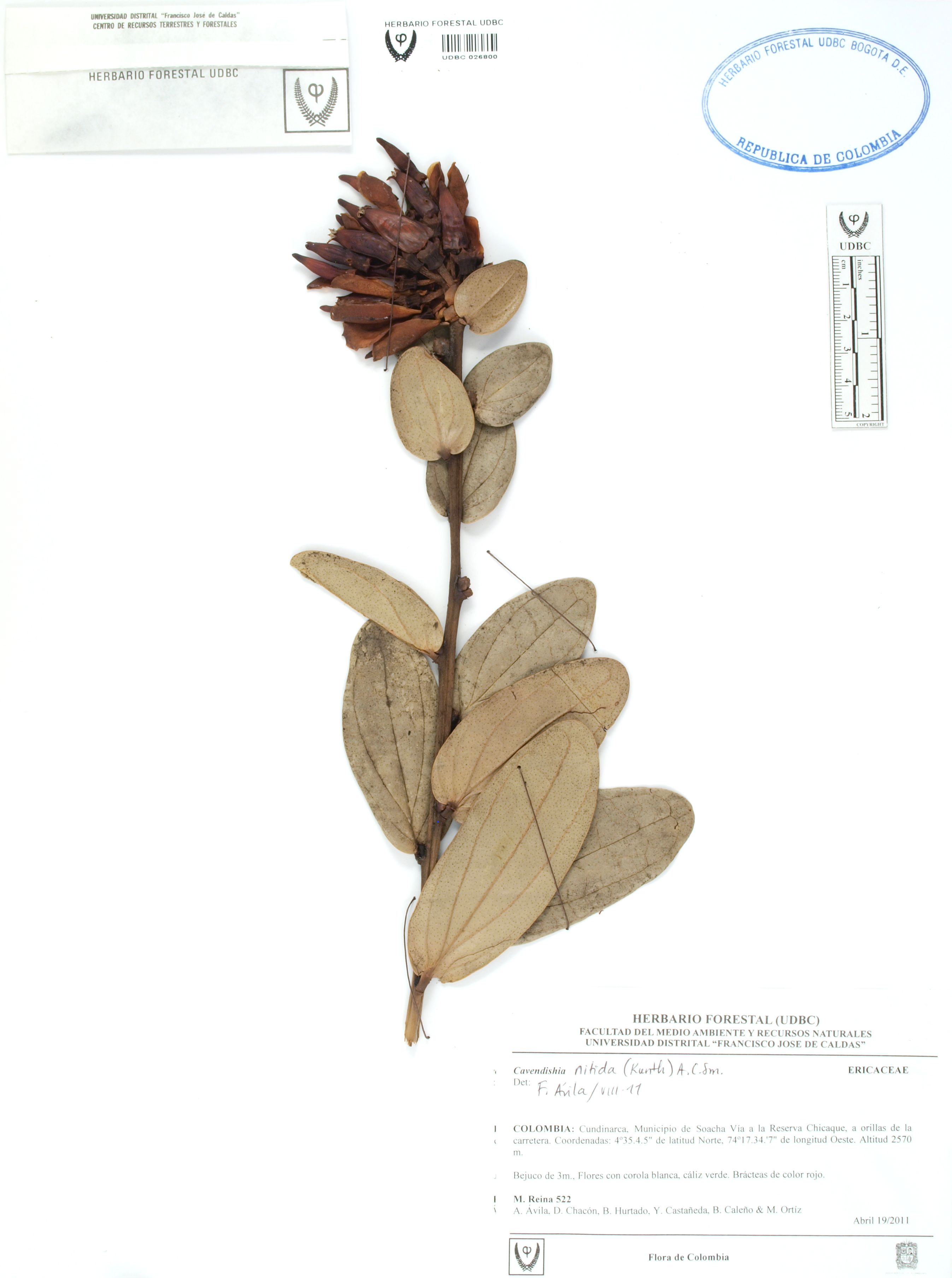 Fotografía del ejemplar Reina, M. 522, determinado como Cavendishia nitida en el año 2011