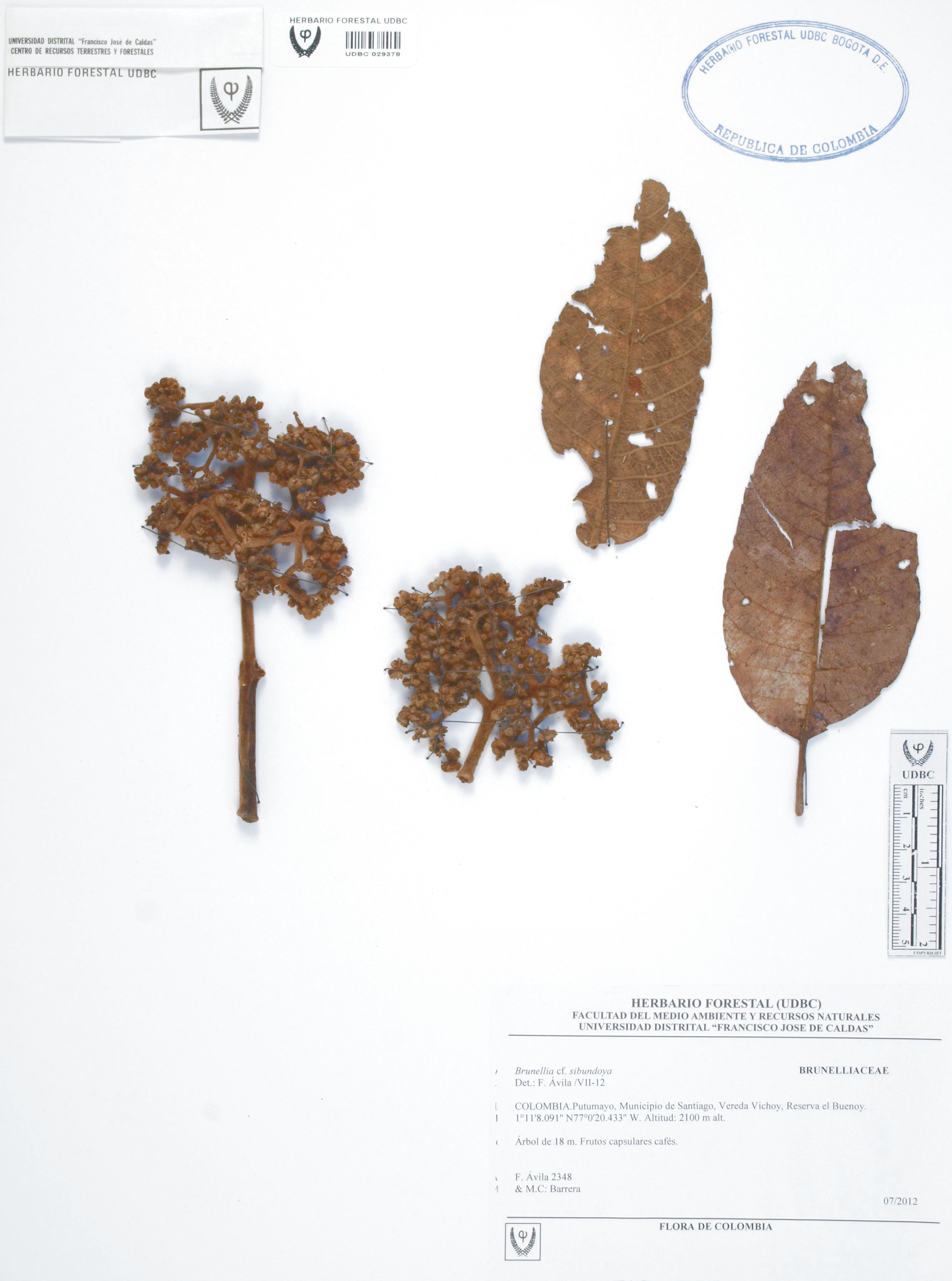 Fotografía del ejemplar Ávila, F. 2348, determinado como Brunellia sibundoya en el año 2012