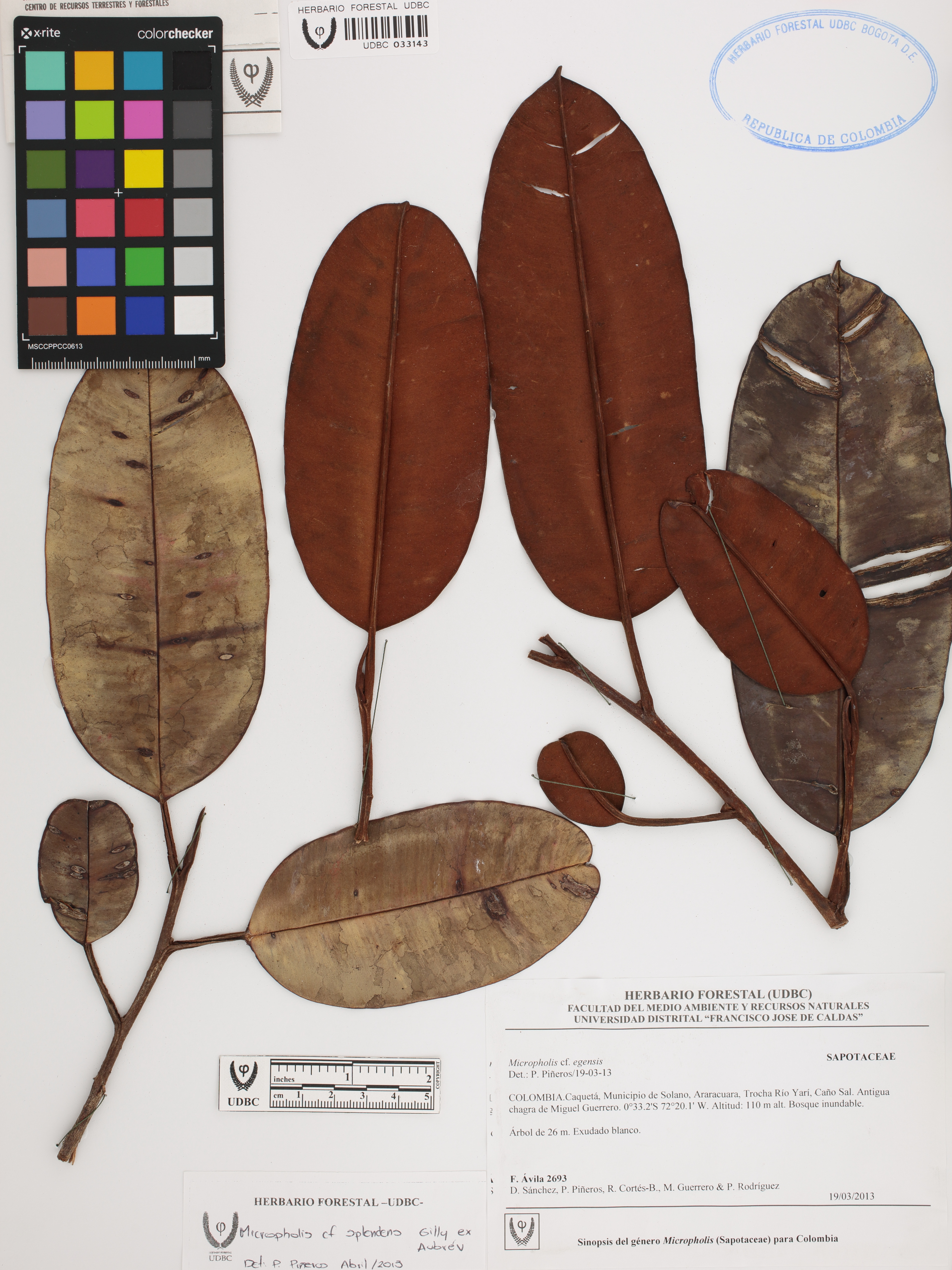 Fotografía del ejemplar Ávila, F. 2693, determinado como Micropholis splendens en el año 2013