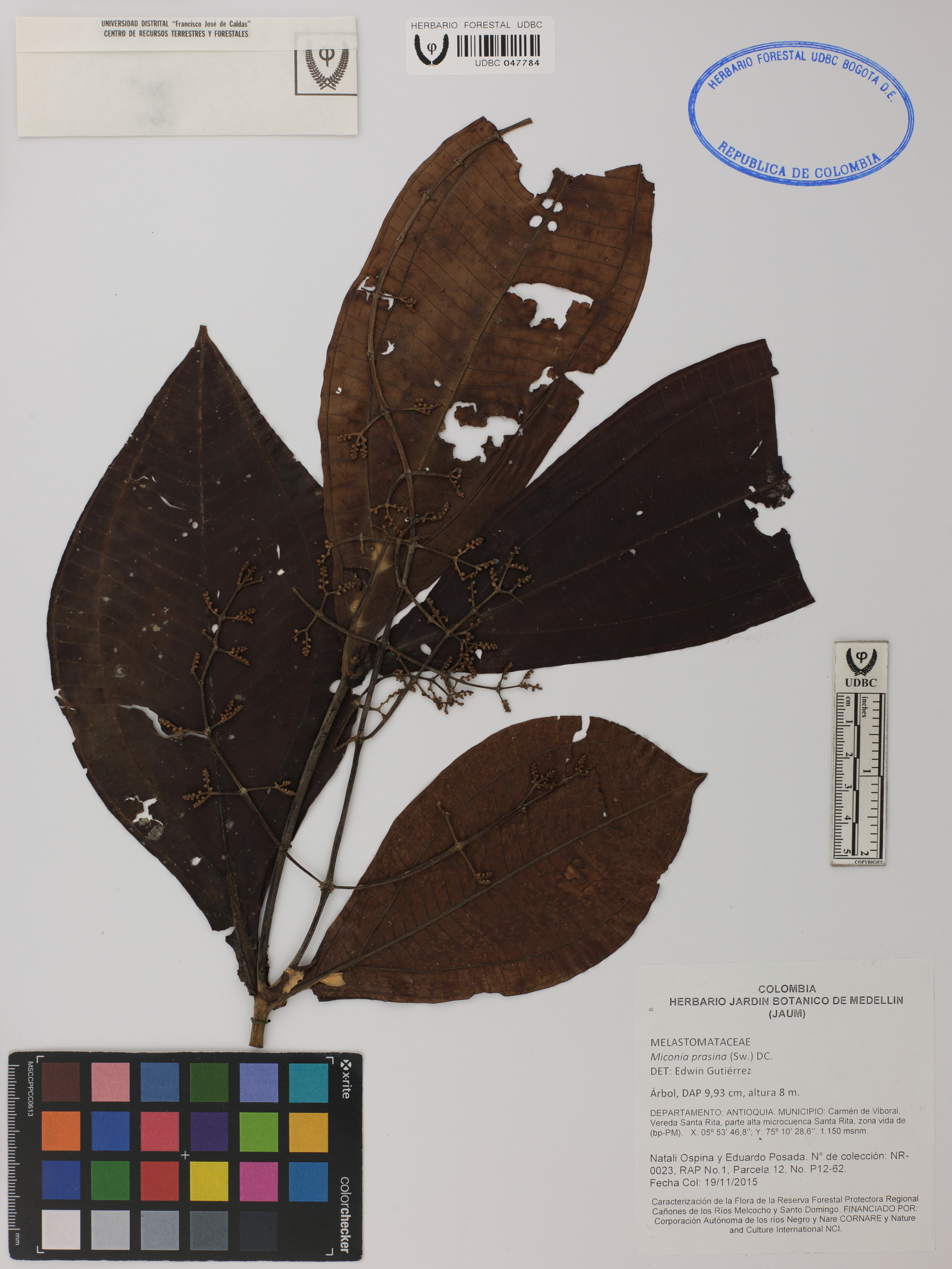 Fotografía del ejemplar Ospina, N. 23, determinado como Miconia prasina en el año 2015