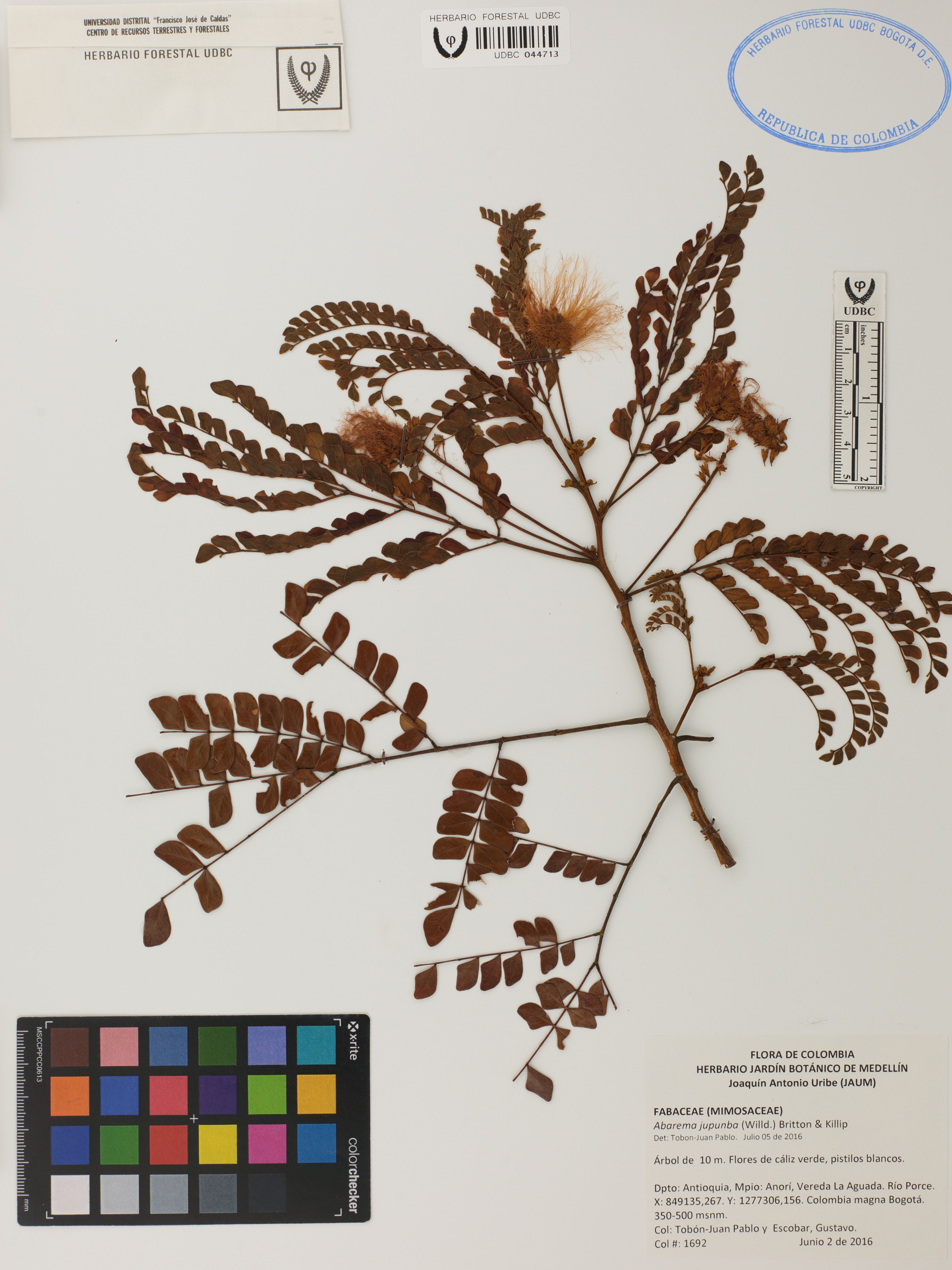 Fotografía del ejemplar Tobón-Agudelo, J. 1692, determinado como Abarema jupunba en el año 2016