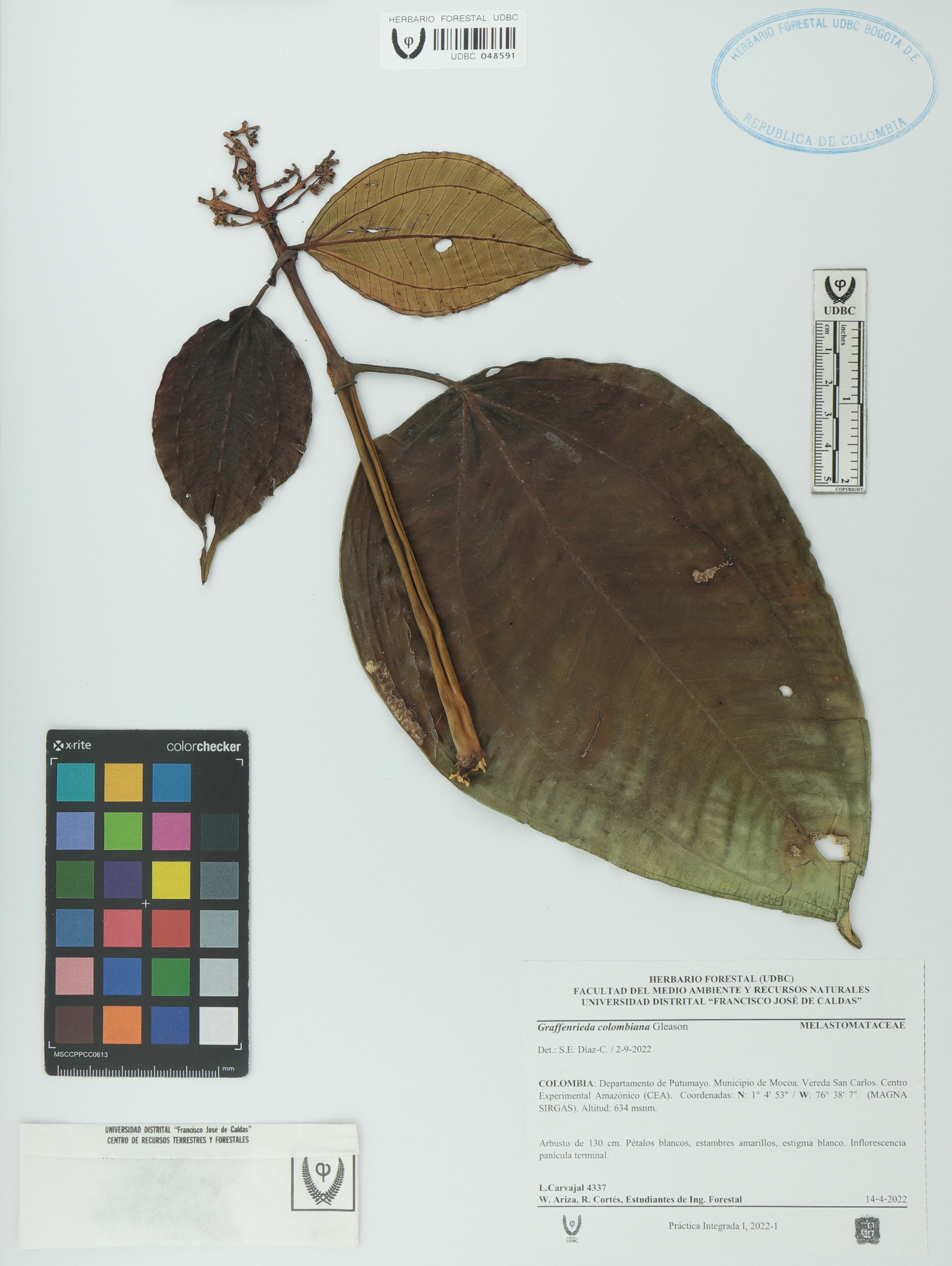 Fotografía del ejemplar Carvajal, L. 4337, determinado como Graffenrieda colombiana en el año 2022