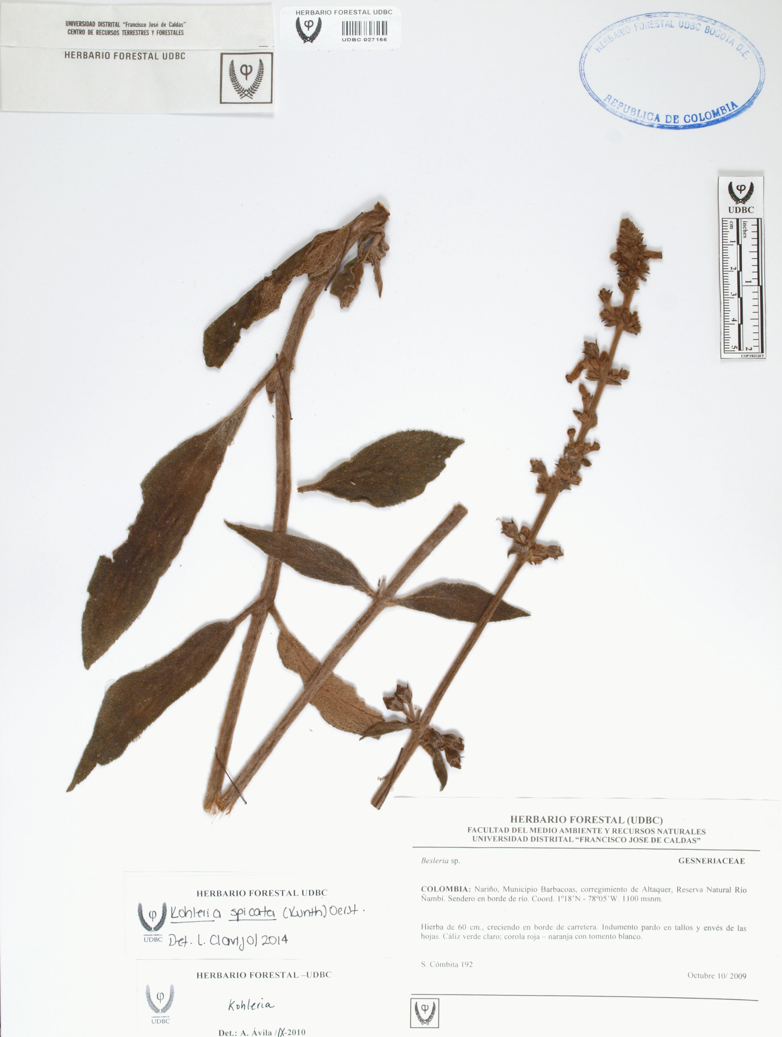 Fotografía del ejemplar Cómbita, S. 192, determinado como Kohleria spicata en el año 2014