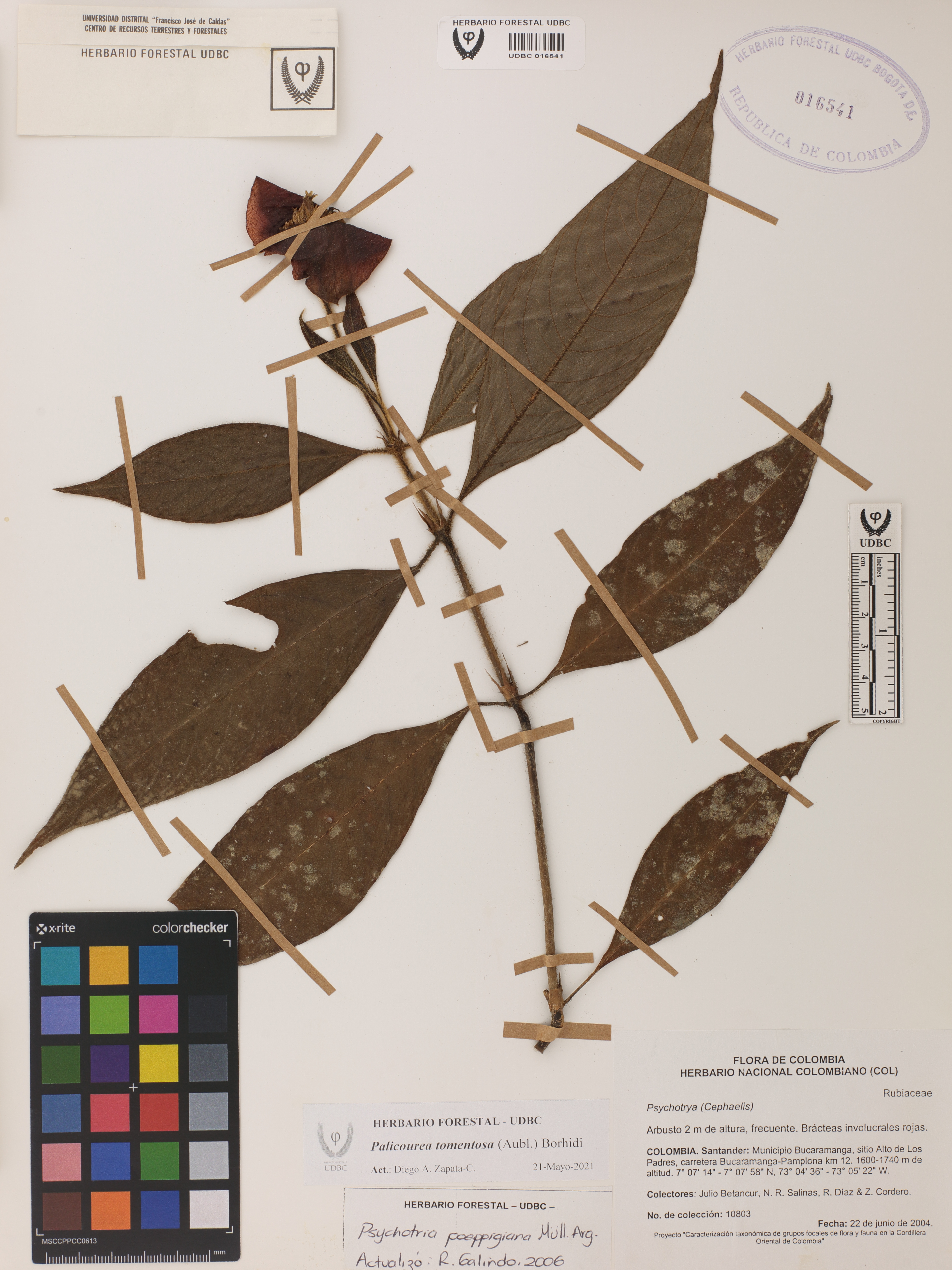 Fotografía del ejemplar Betancur, J. 10803, determinado como Palicourea tomentosa en el año 2006