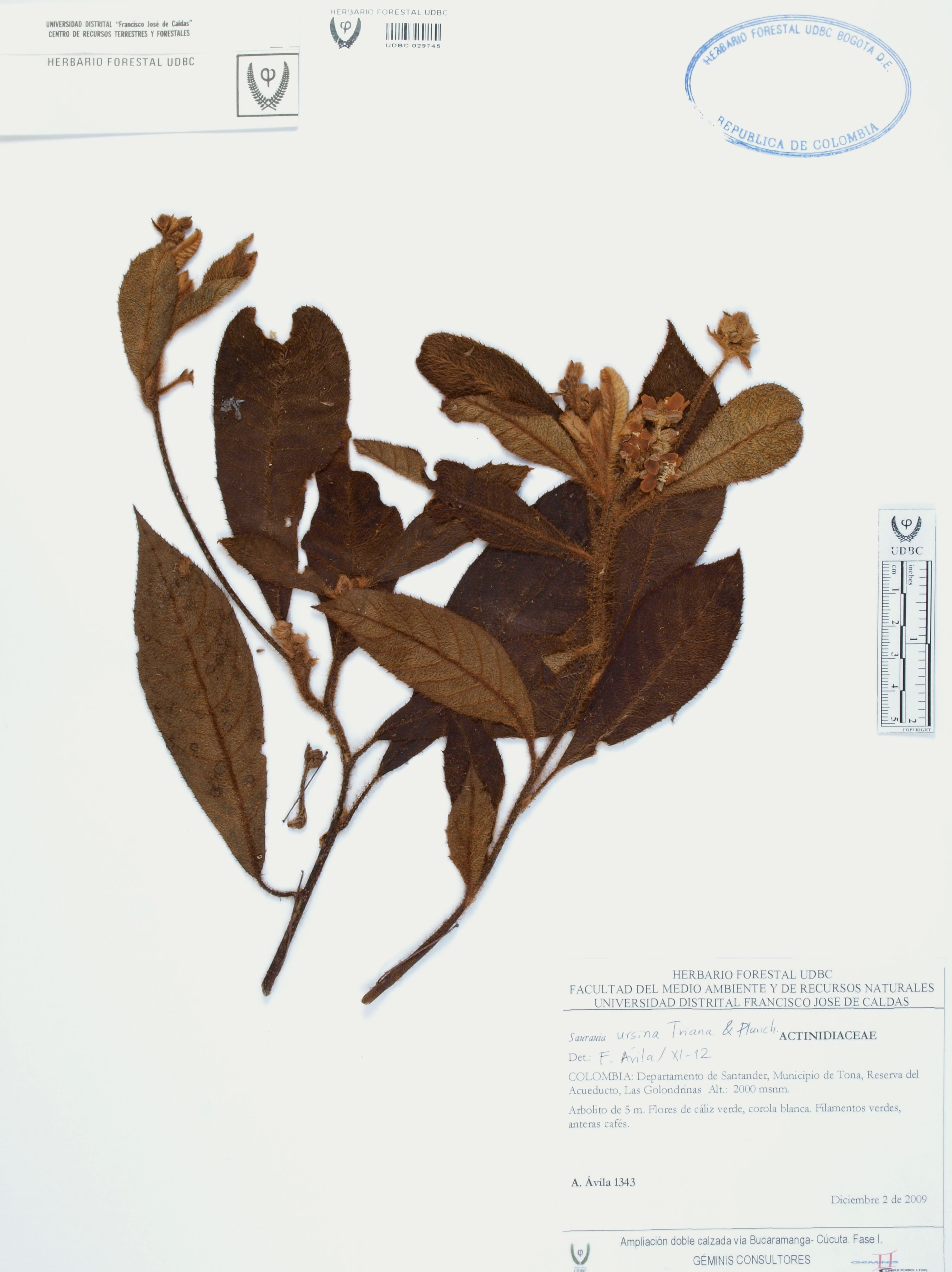 Fotografía del ejemplar Ávila, F. 1343, determinado como Saurauia ursina en el año 2012