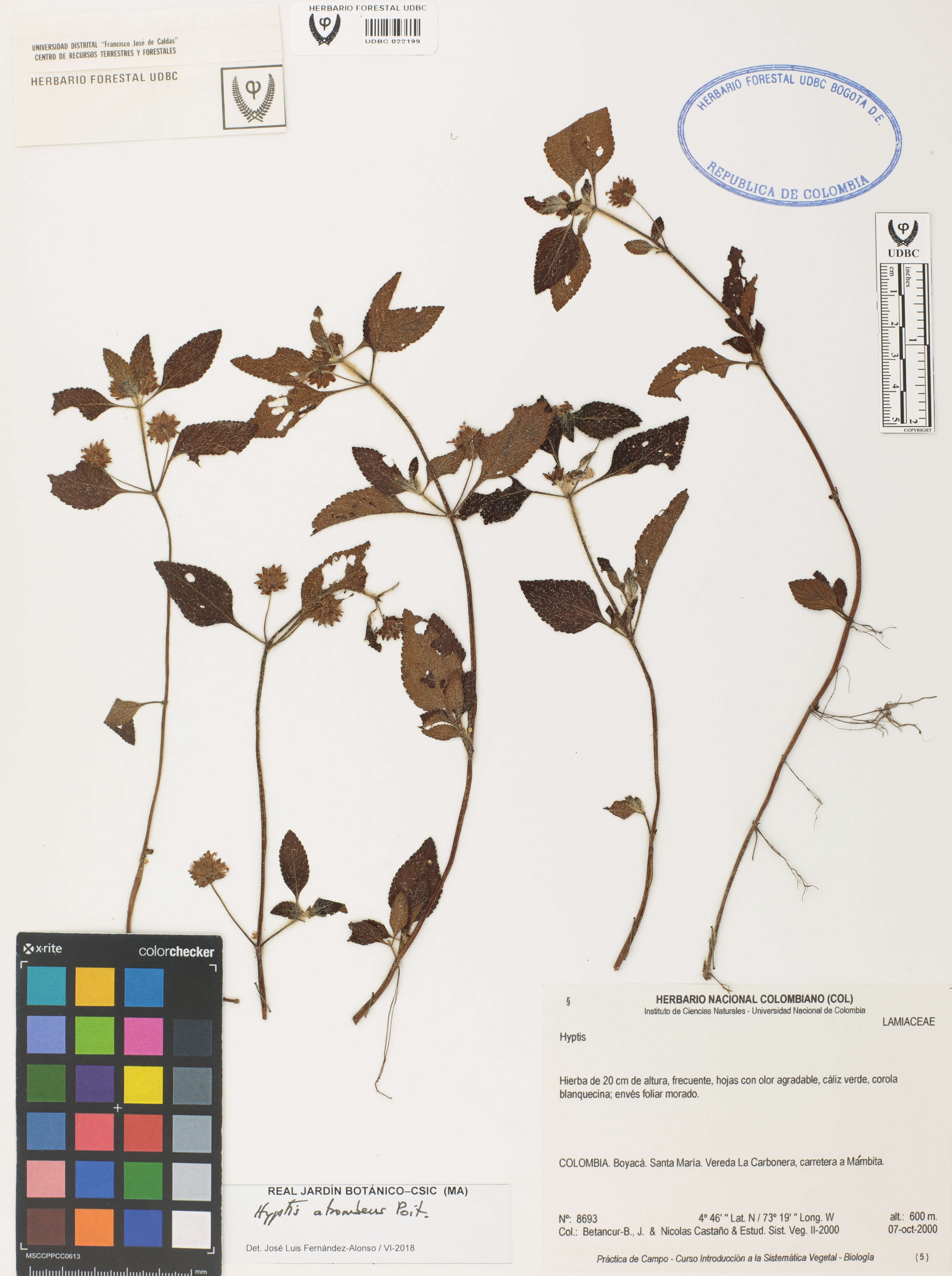 Fotografía del ejemplar Betancurt-B., J. 8693, determinado como Hyptis atrorubens en el año 2018