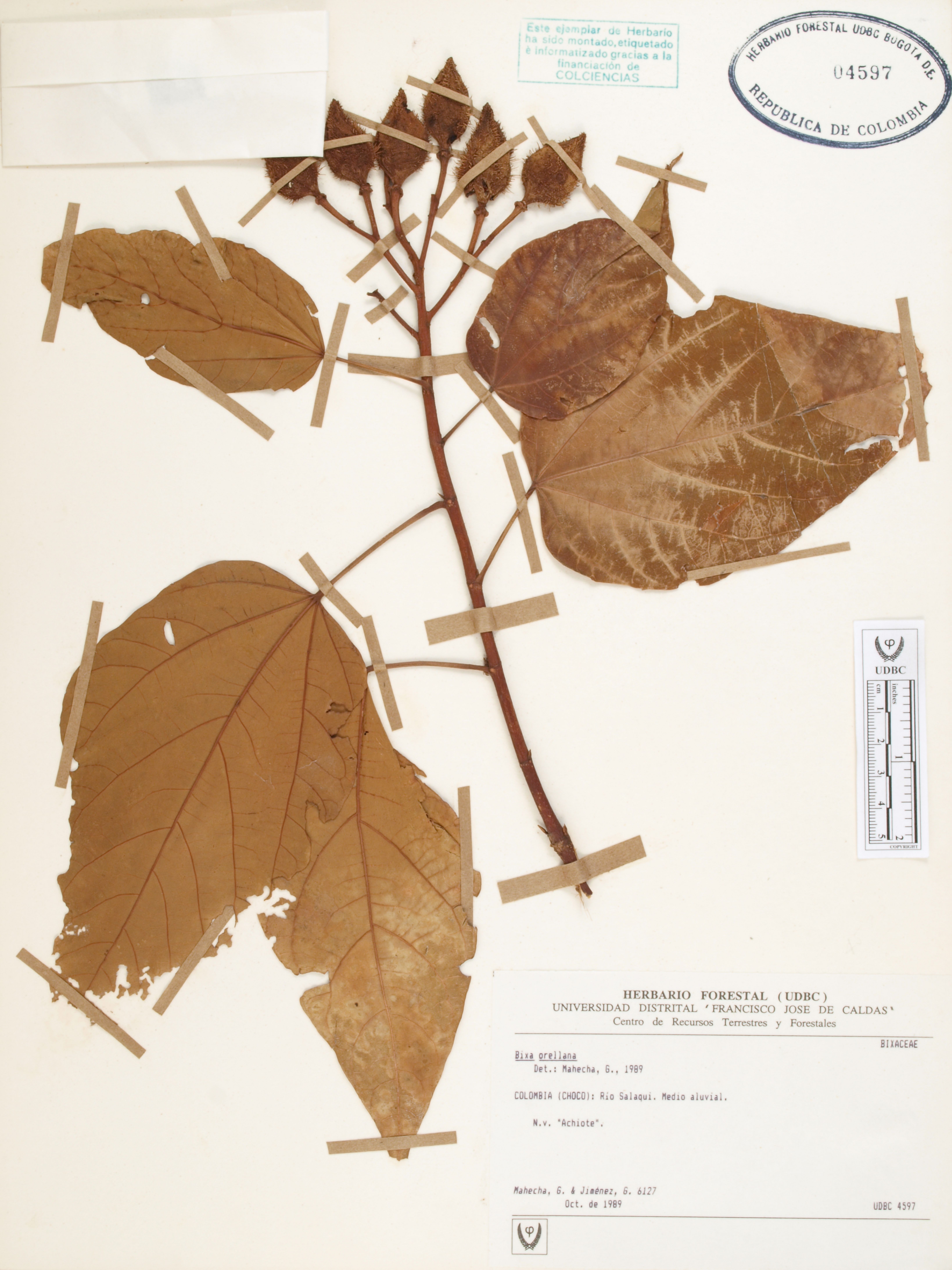 Fotografía del ejemplar Mahecha, G. 6127, determinado como Bixa orellana en el año 1989