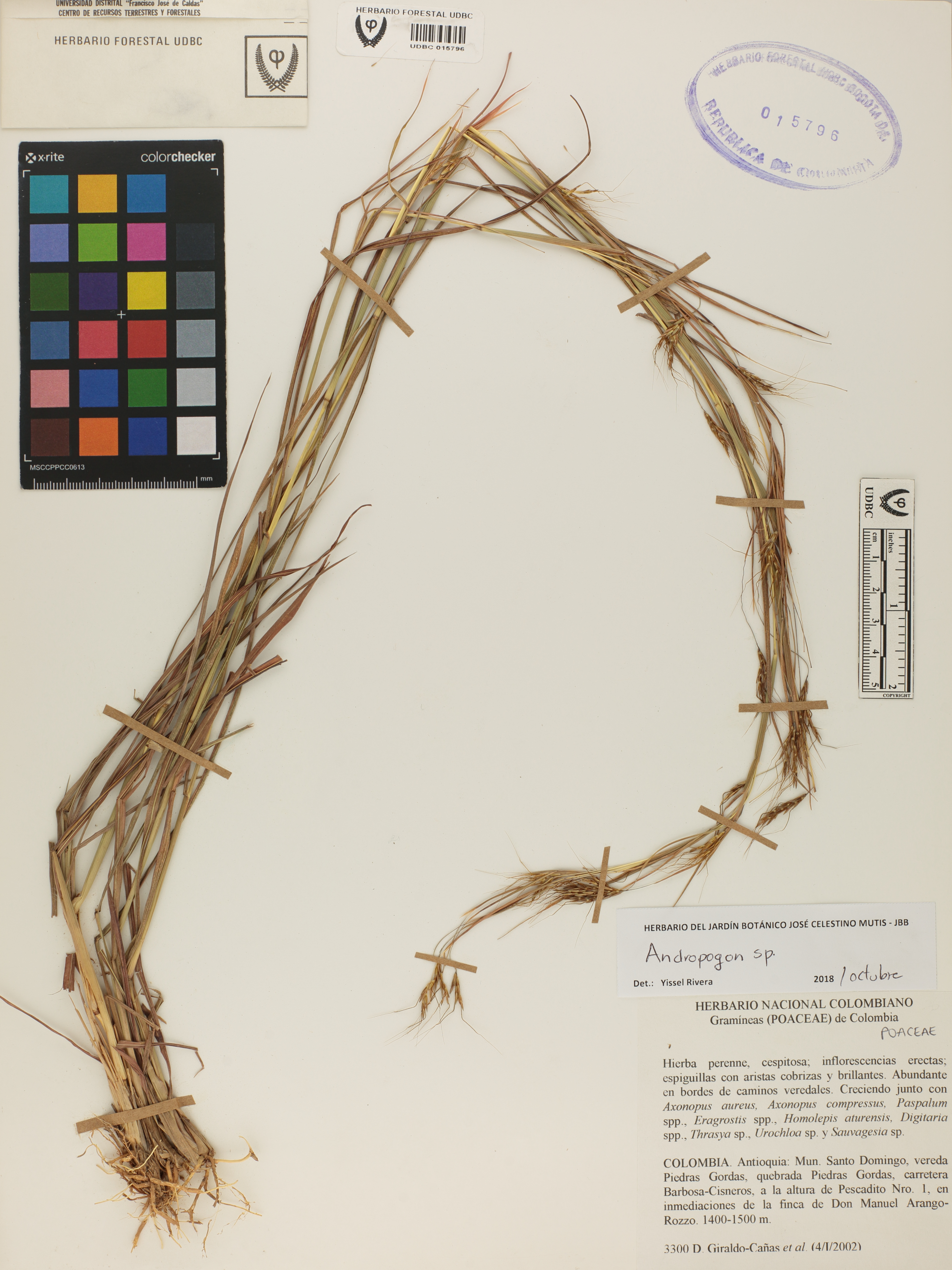 Fotografía del ejemplar Giraldo-Cañas, D. 3300, determinado como Andropogon sp. en el año 2018