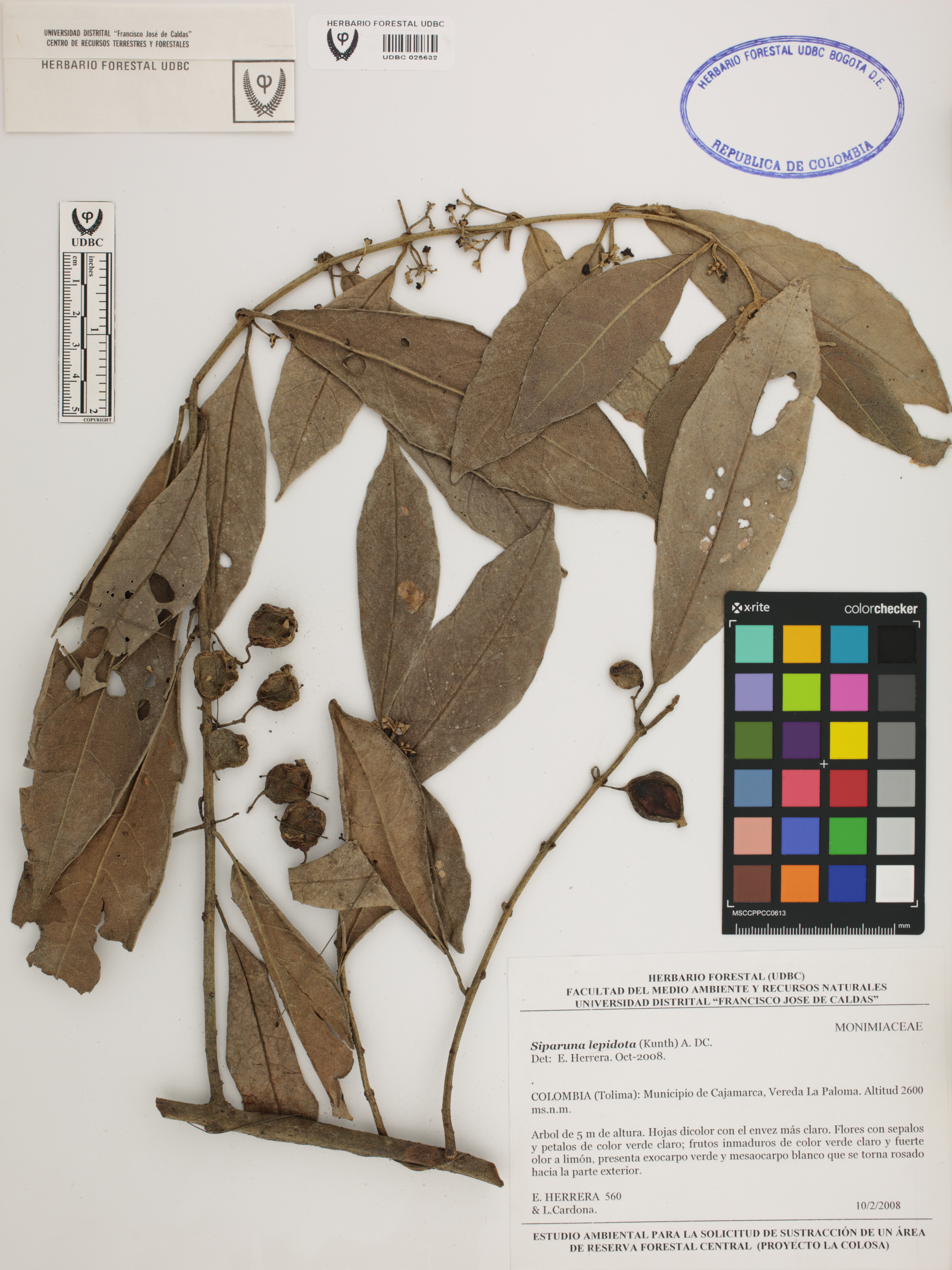 Fotografía del ejemplar Herrera, E. 560, determinado como Siparuna lepidota en el año 2008
