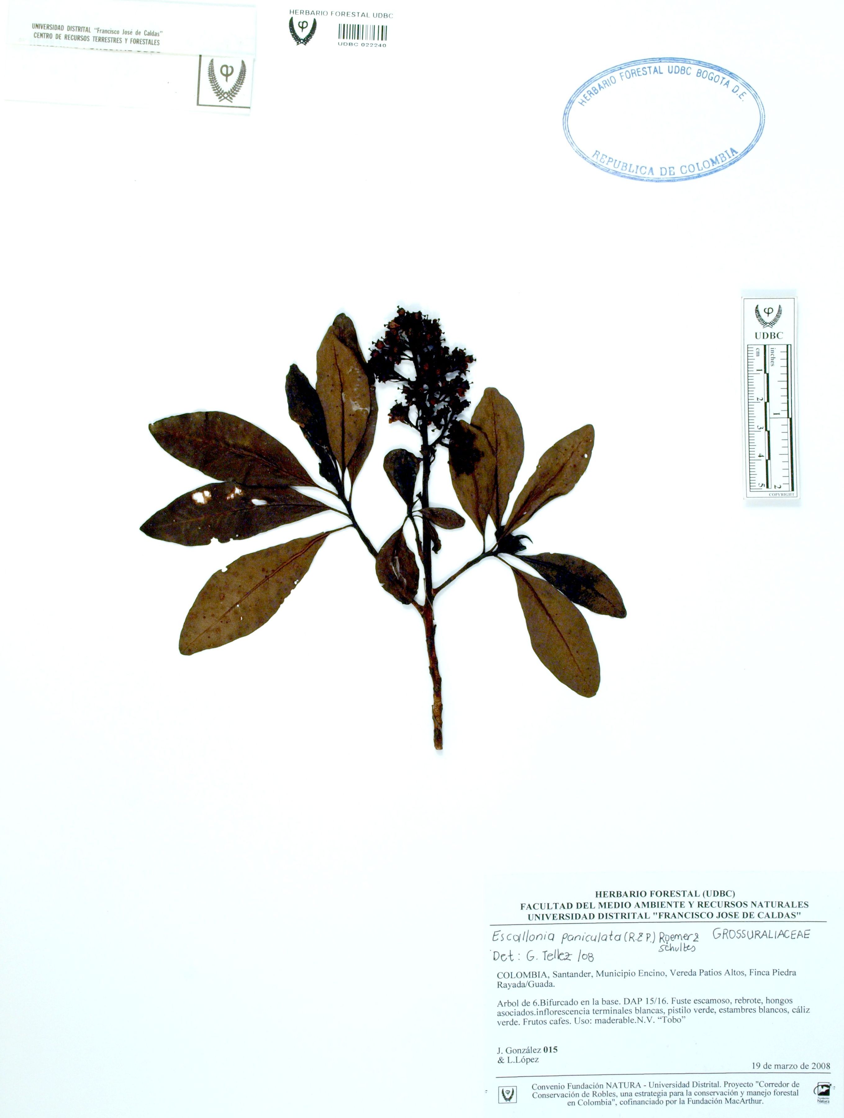 Fotografía del ejemplar González, J. 15, determinado como Escallonia paniculata en el año 2008