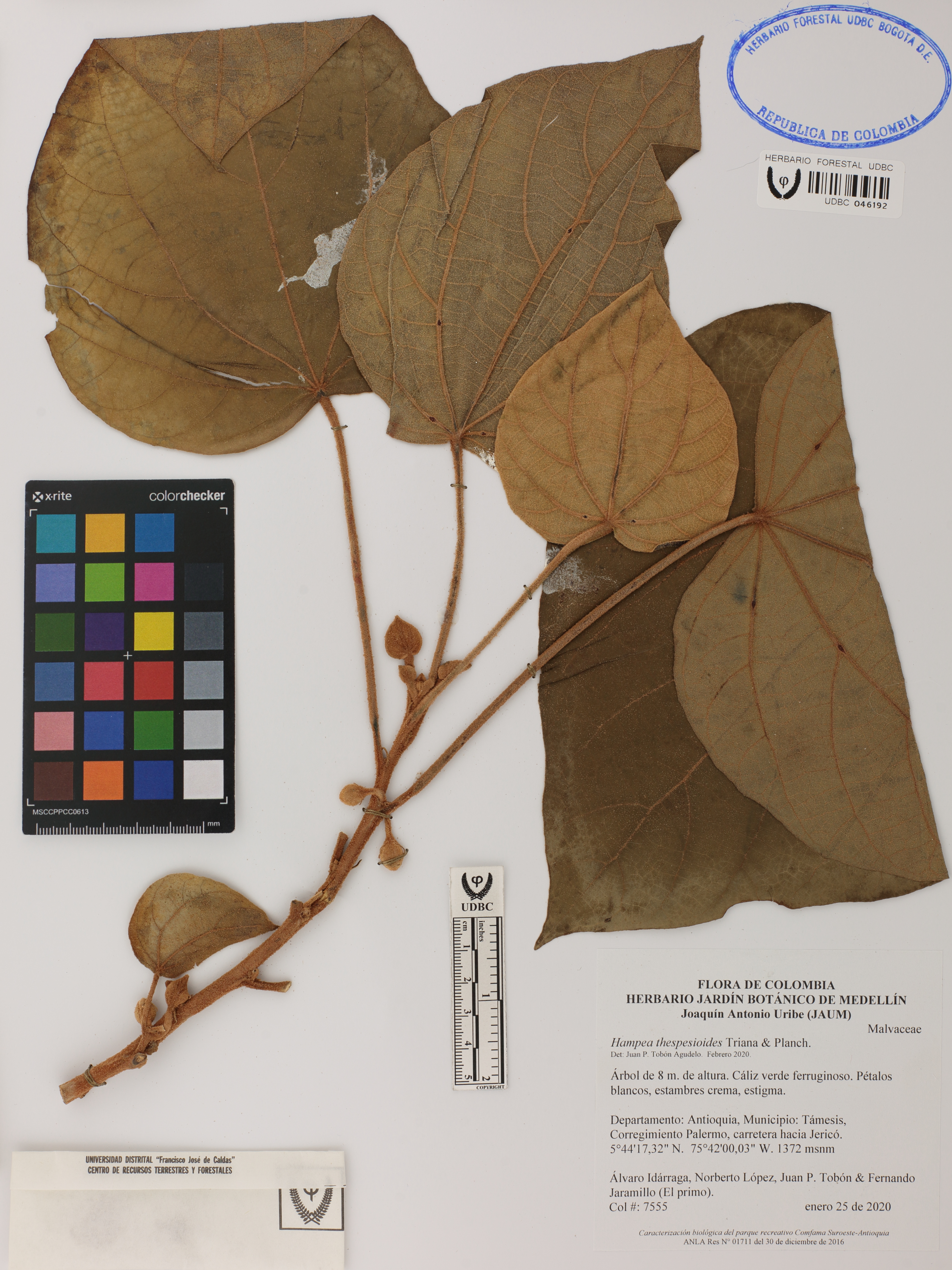 Fotografía del ejemplar Idárraga, Á. 7555, determinado como Hampea thespesioides en el año 2020