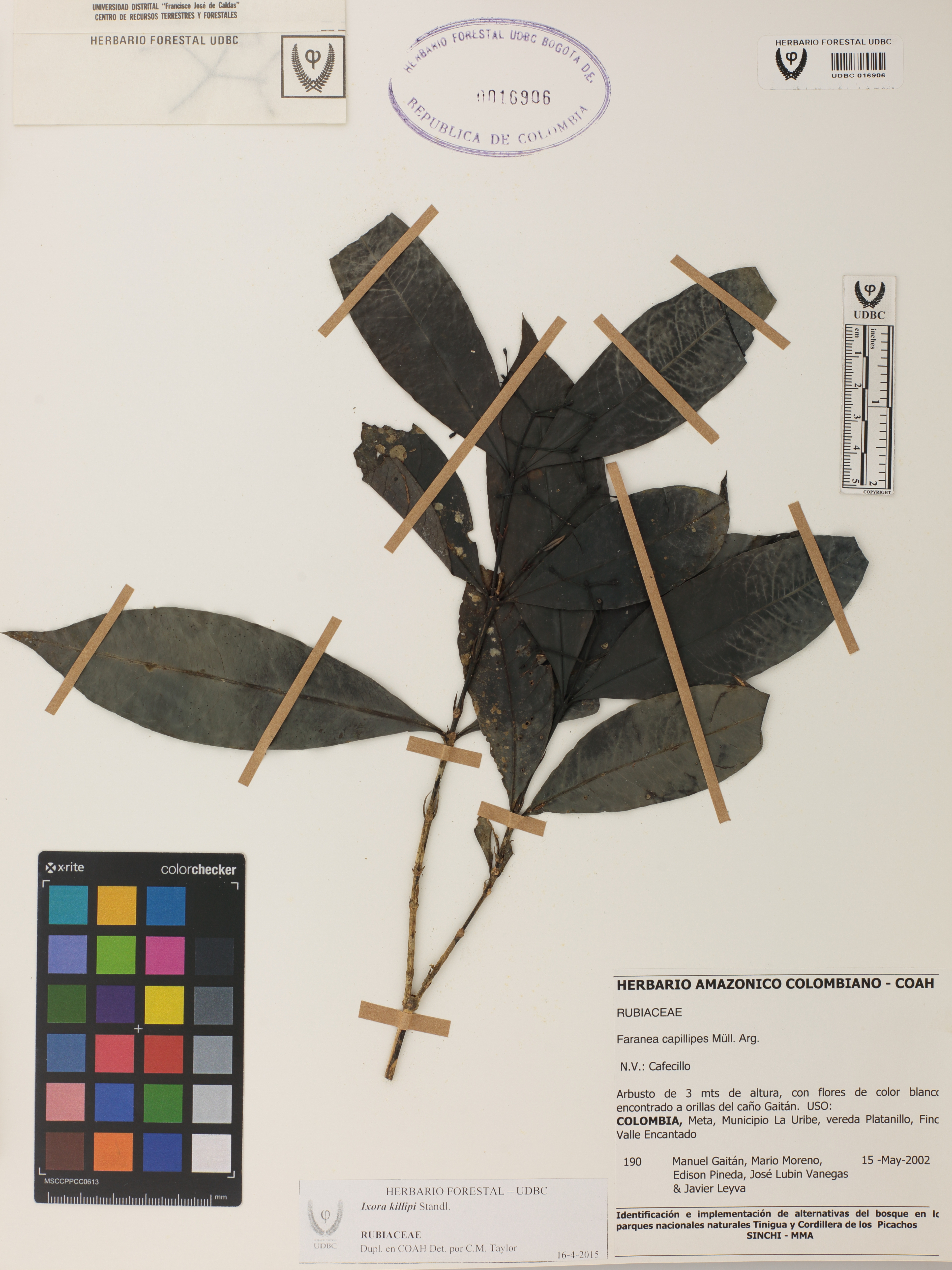 Fotografía del ejemplar Gaitán, M. 190, determinado como Ixora killipii en el año 2015