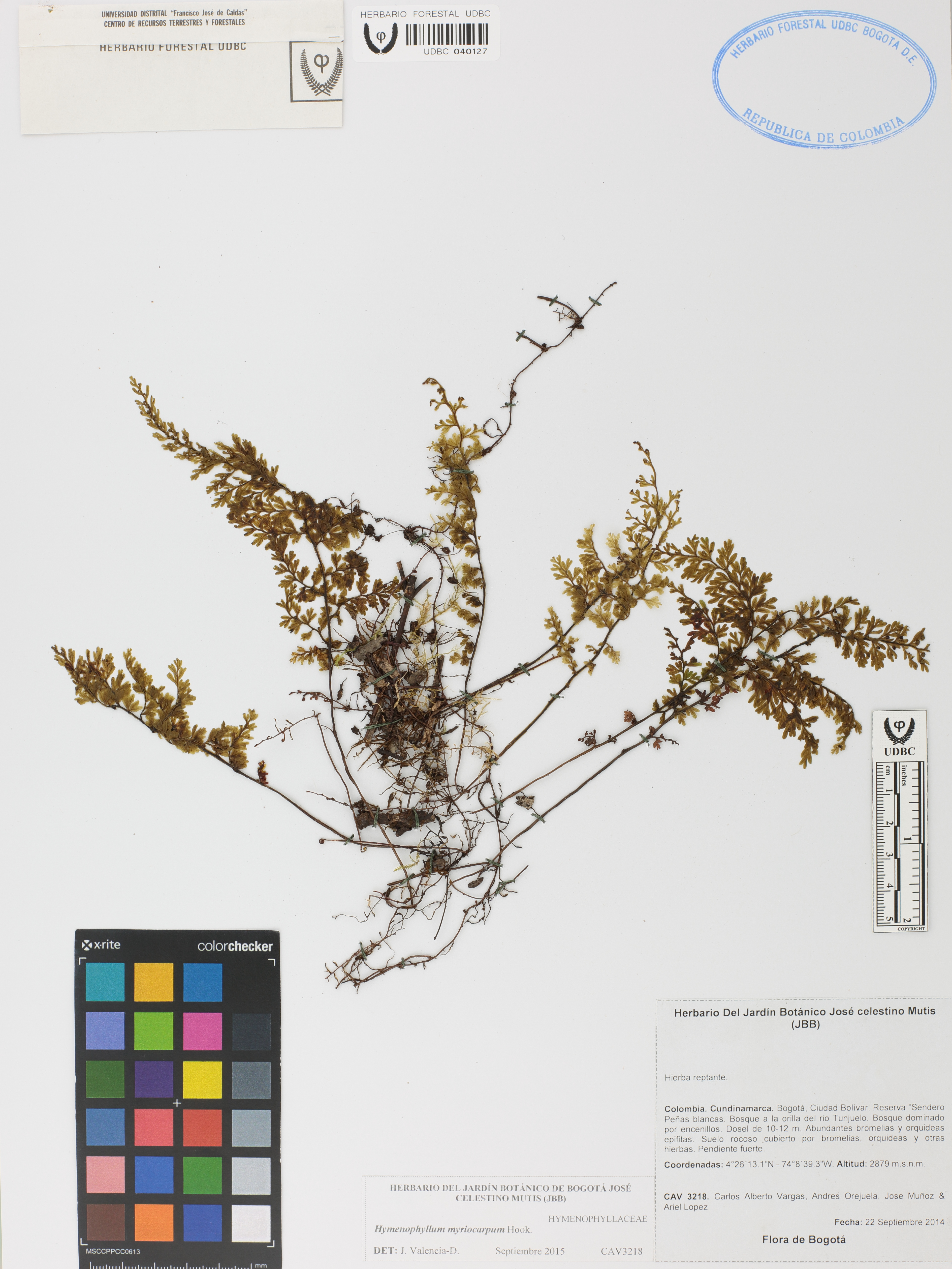 Fotografía del ejemplar Vargas, C. 3218, determinado como Hymenophyllum myriocarpum en el año 2015