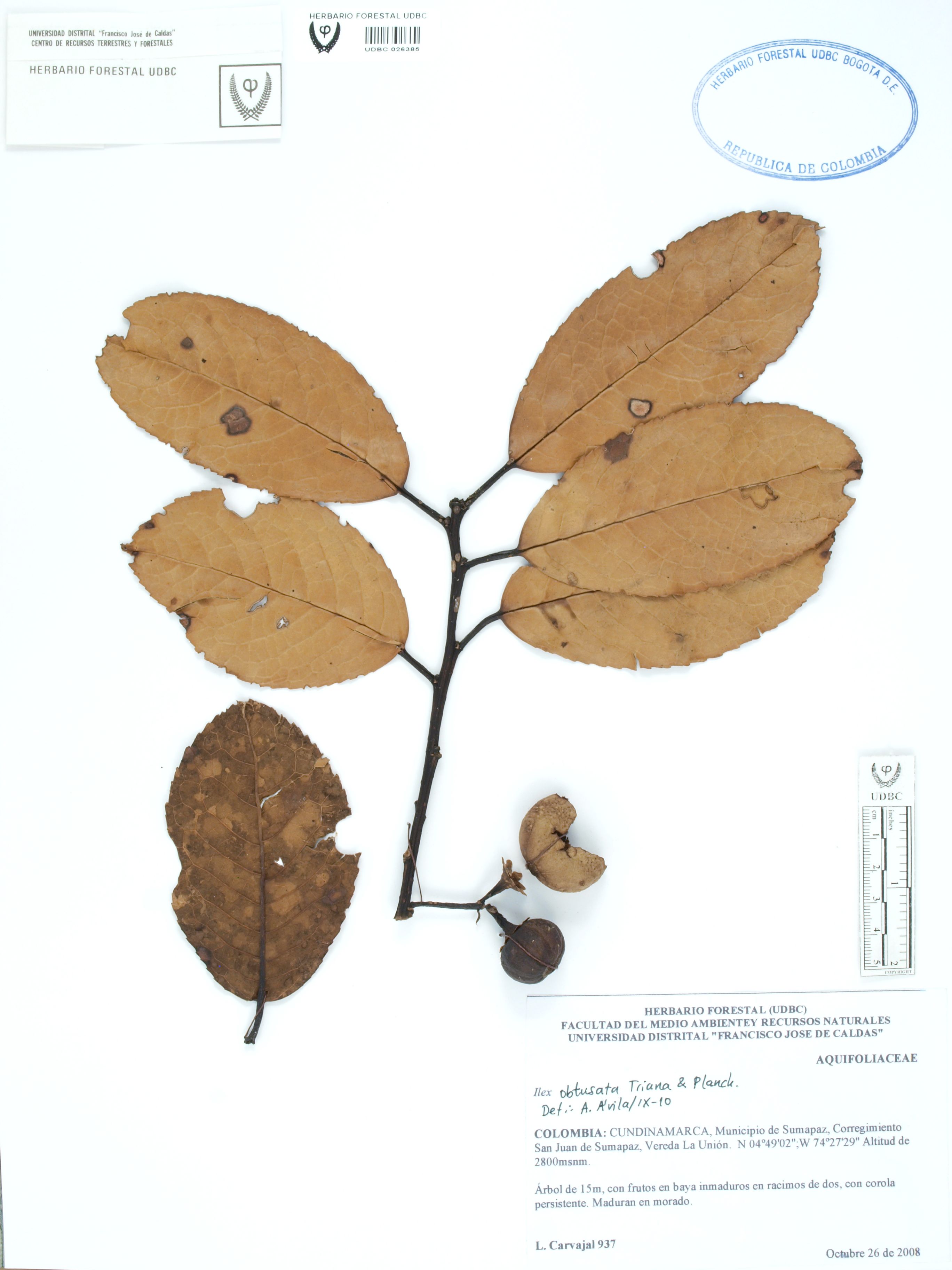 Fotografía del ejemplar Carvajal, L. 937, determinado como Ilex obtusata en el año 2010