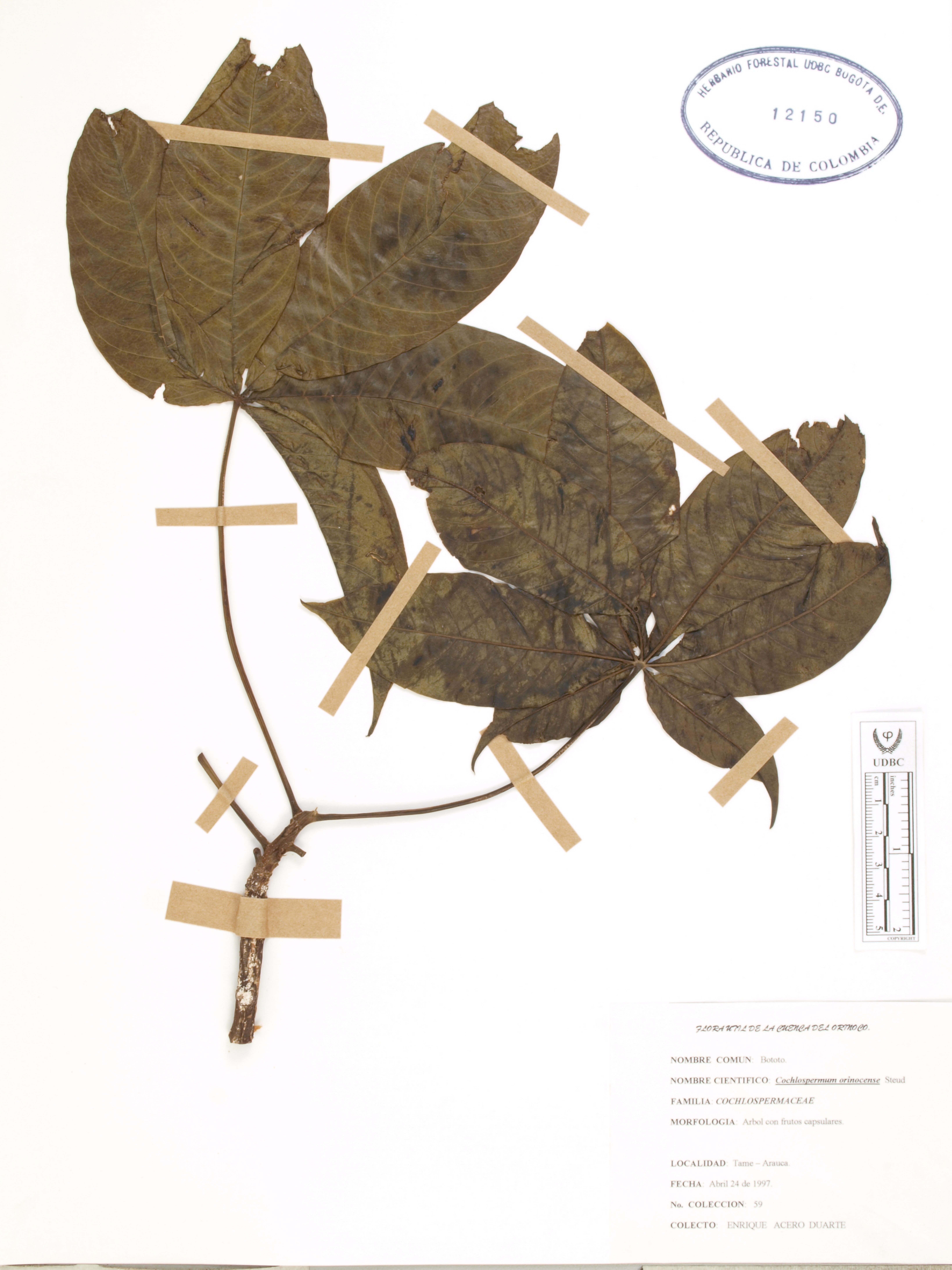 Fotografía del ejemplar Acero, E. 59, determinado como Cochlospermum orinocense