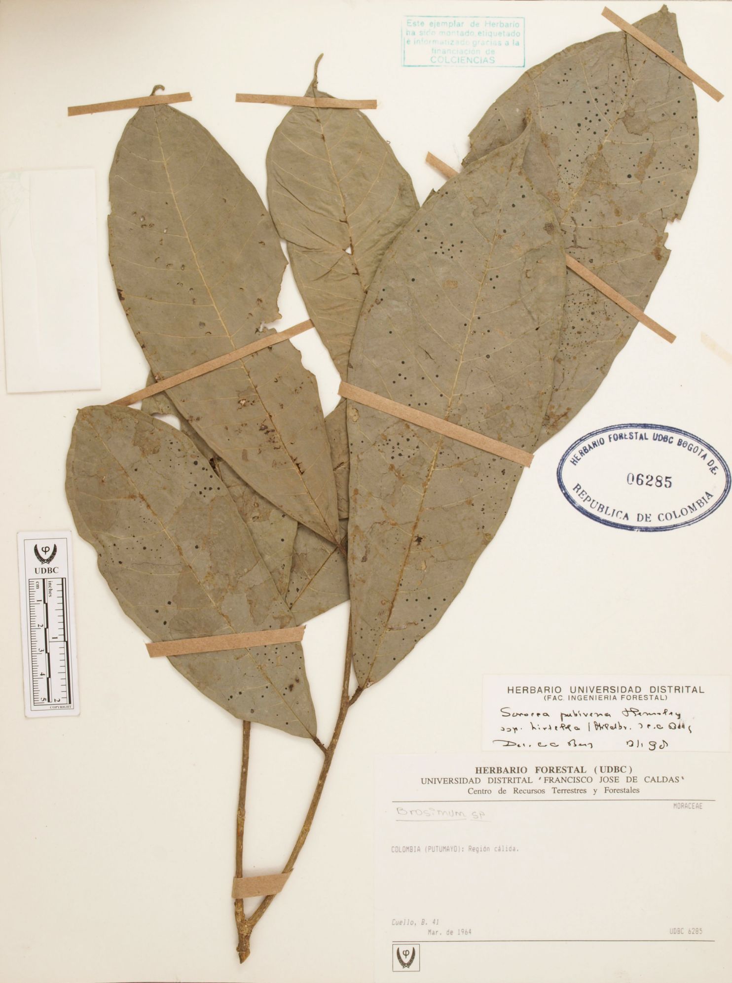 Fotografía del ejemplar Cuello, B. 41, determinado como Sorocea pubivena subsp. hirtella en el año 1997