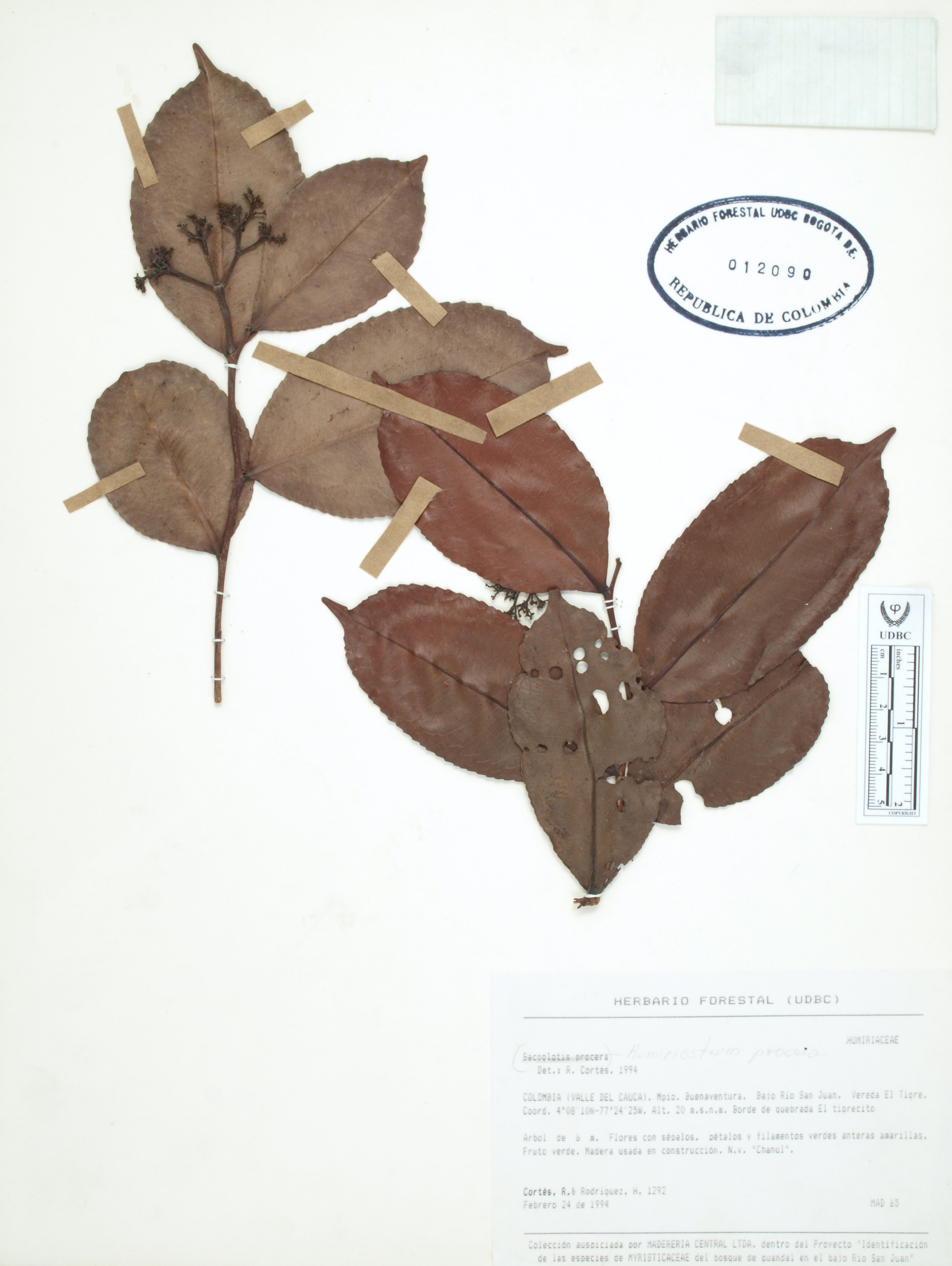 Fotografía del ejemplar Cortés-B., R. 1292, determinado como Humiriastrum procerum en el año 1994
