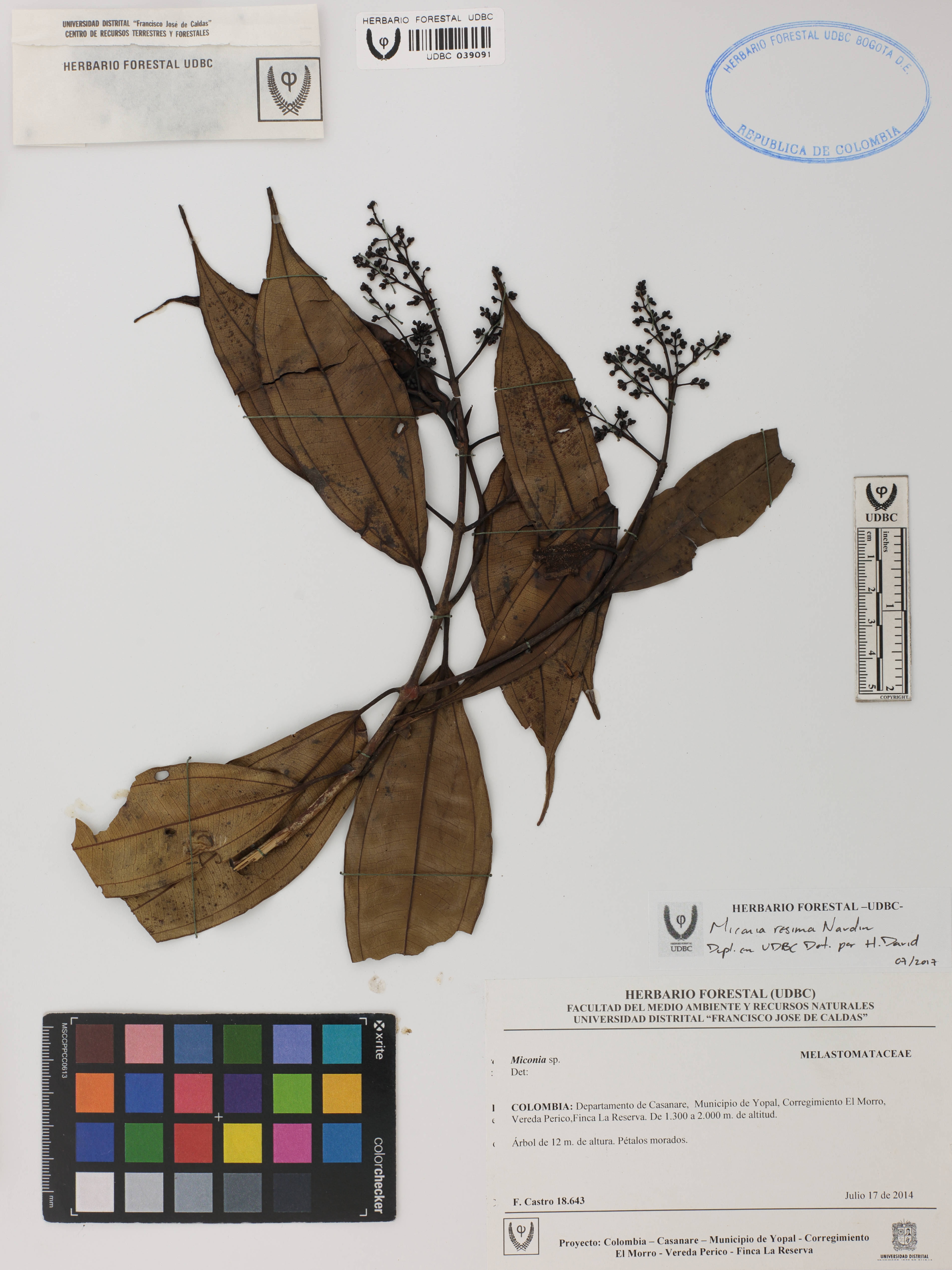 Fotografía del ejemplar Castro, F. 18643, determinado como Miconia resima en el año 2017