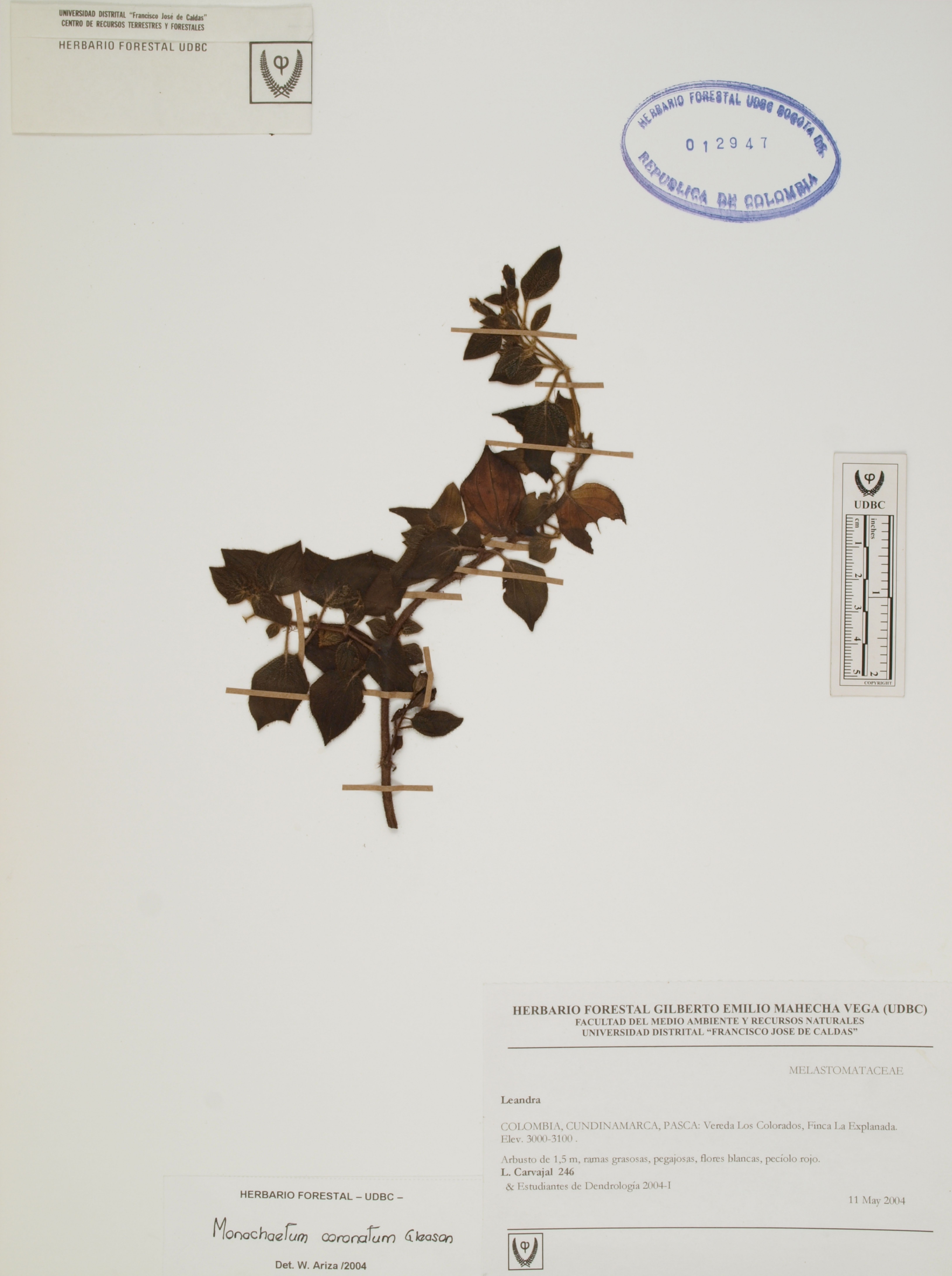 Fotografía del ejemplar Carvajal, L. 246, determinado como Monochaetum coronatum en el año 2004