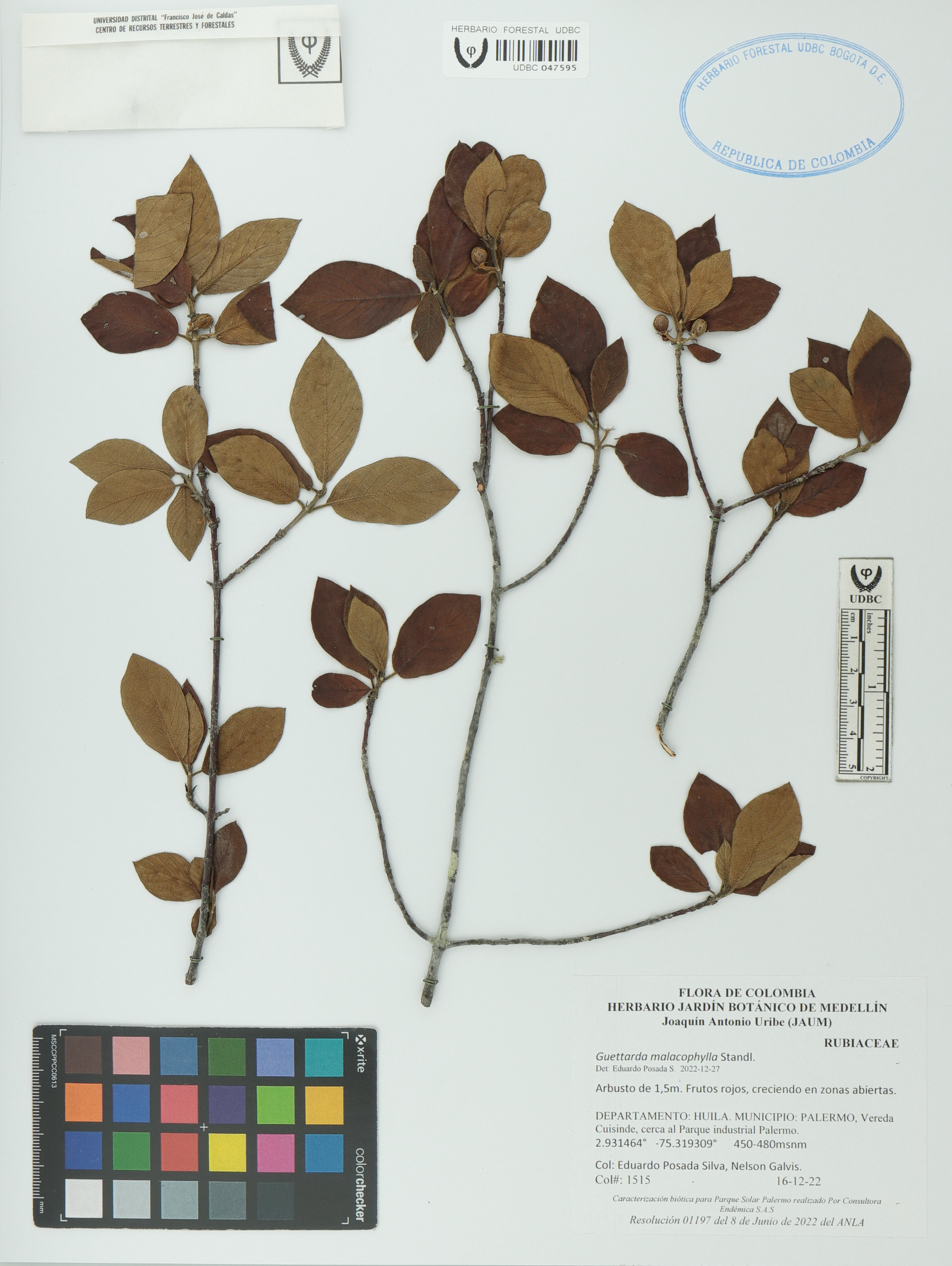 Fotografía del ejemplar Posada, E. 1515, determinado como Guettarda malacophylla en el año 2022