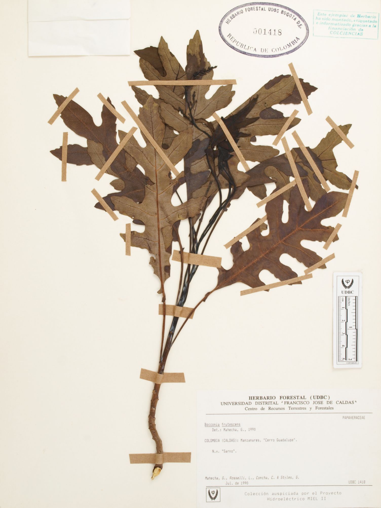 Fotografía del ejemplar Mahecha, G., determinado como Bocconia frutescens en el año 1990