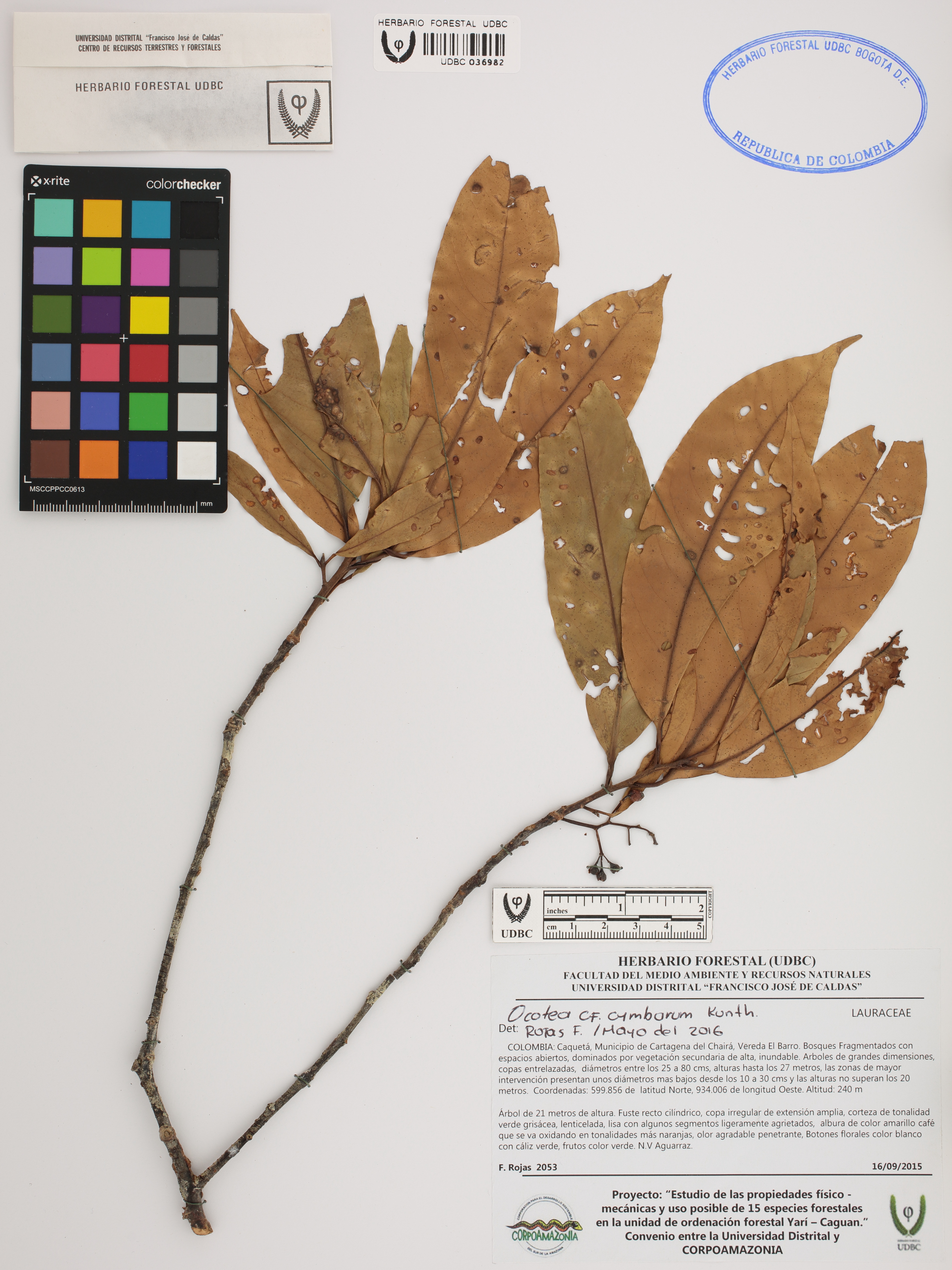 Fotografía del ejemplar Rojas, F. 2053, determinado como Mespilodaphne cymbarum en el año 2016