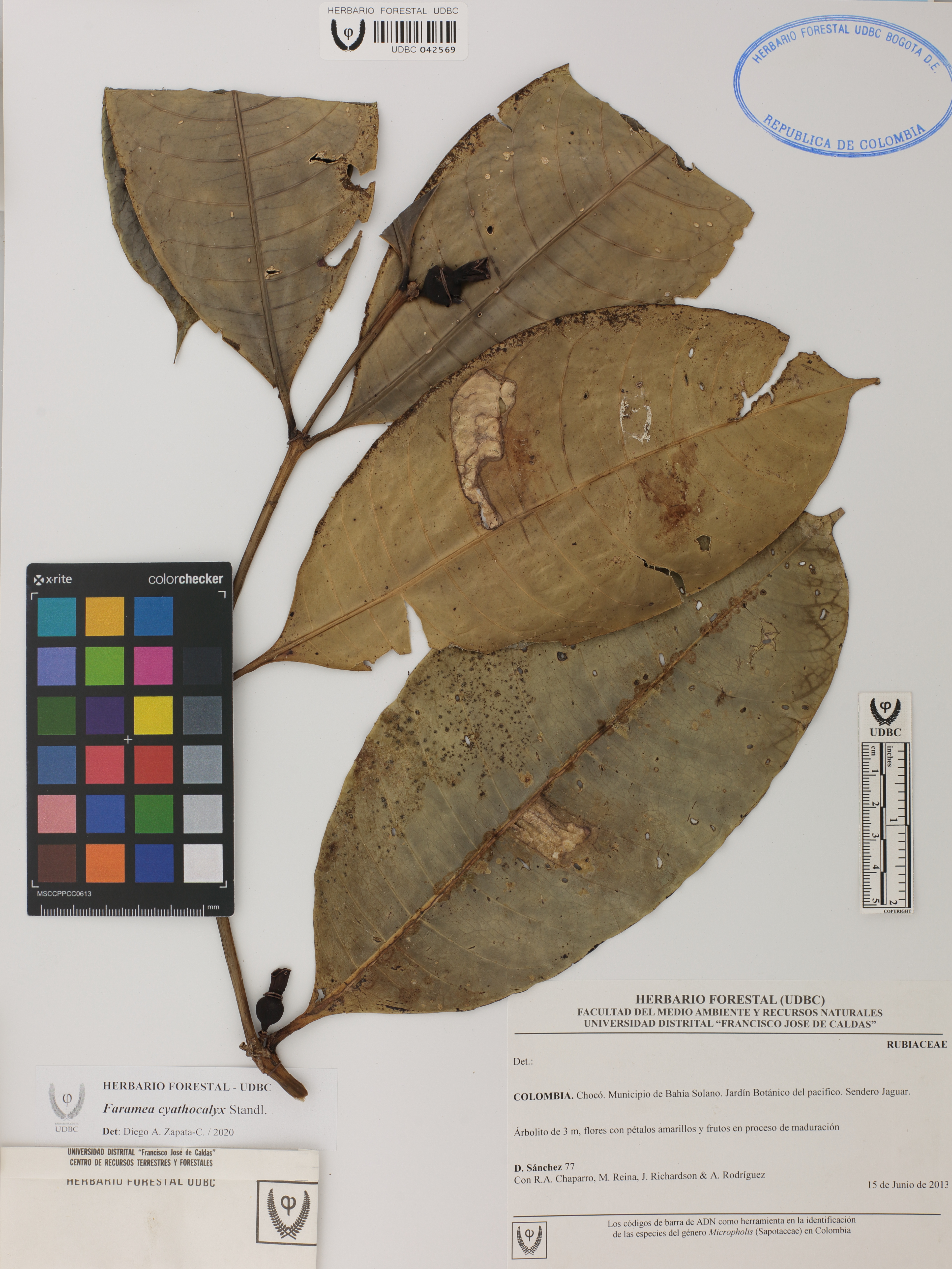 Fotografía del ejemplar Sánchez, D. 77, determinado como Faramea cyathocalyx en el año 2020