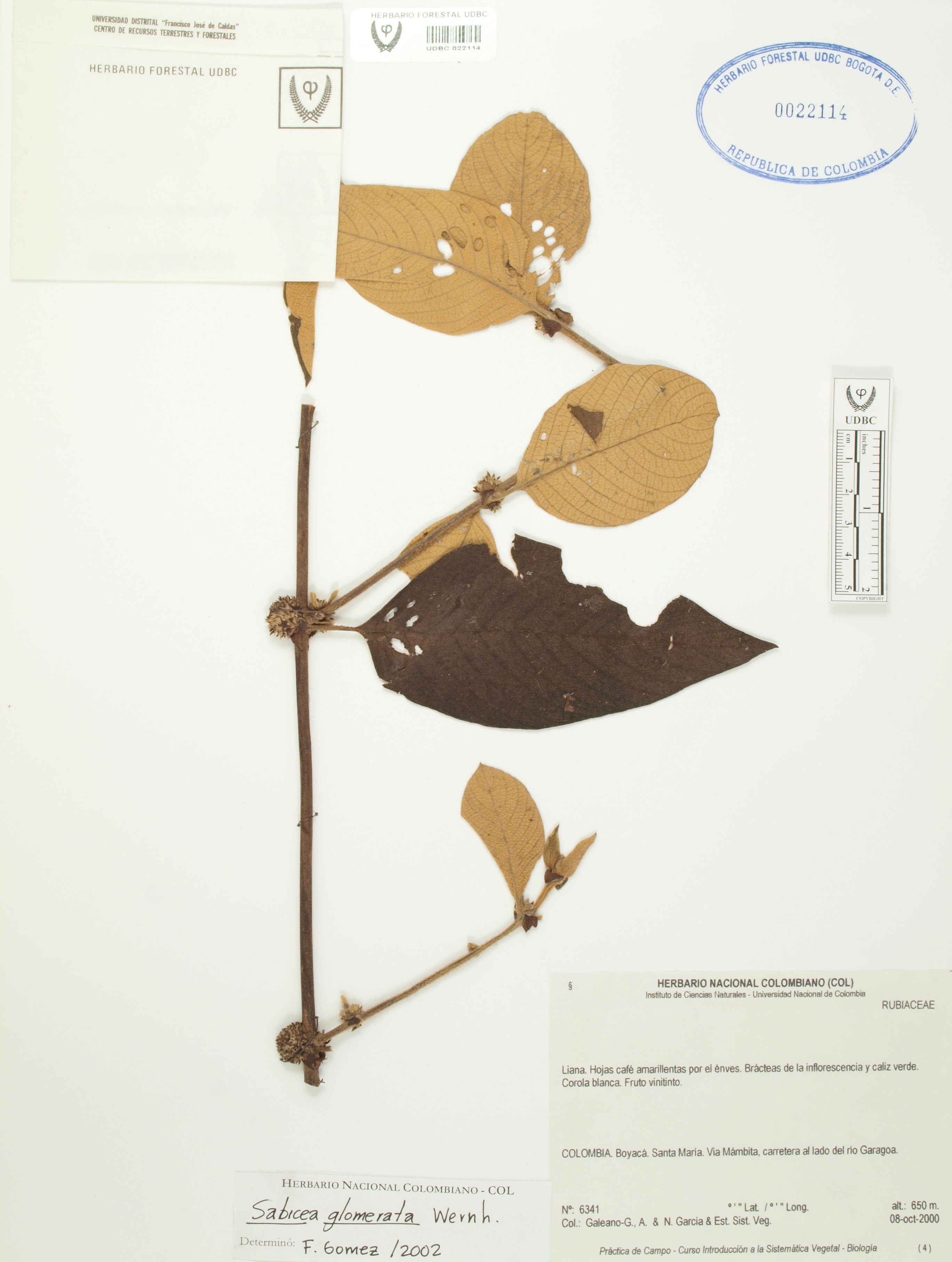 Fotografía del ejemplar Galeano, G. 6341, determinado como Sabicea glomerata en el año 2002