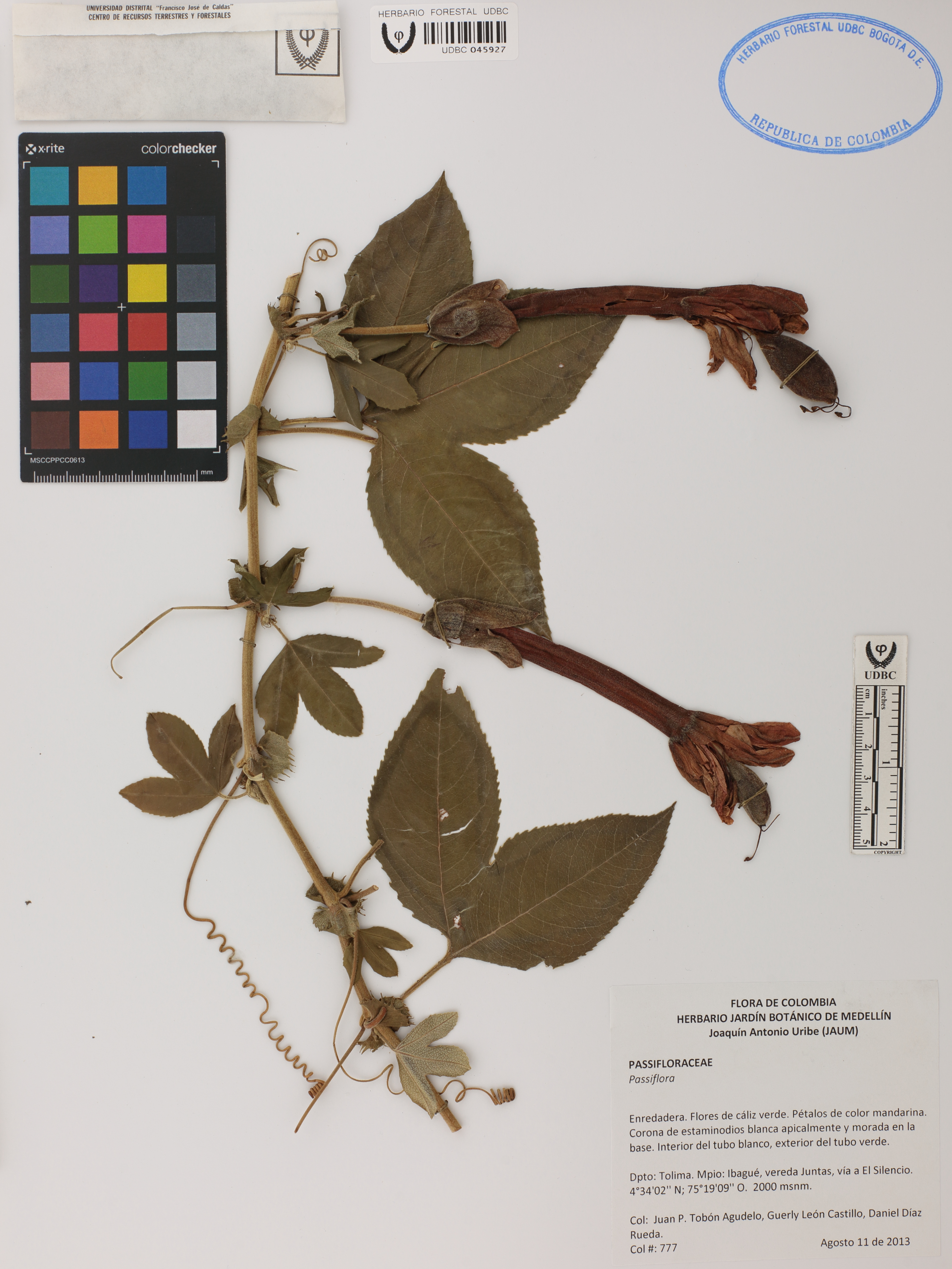 Fotografía del ejemplar Tobón-Agudelo, J. 777, determinado como Passiflora sp.