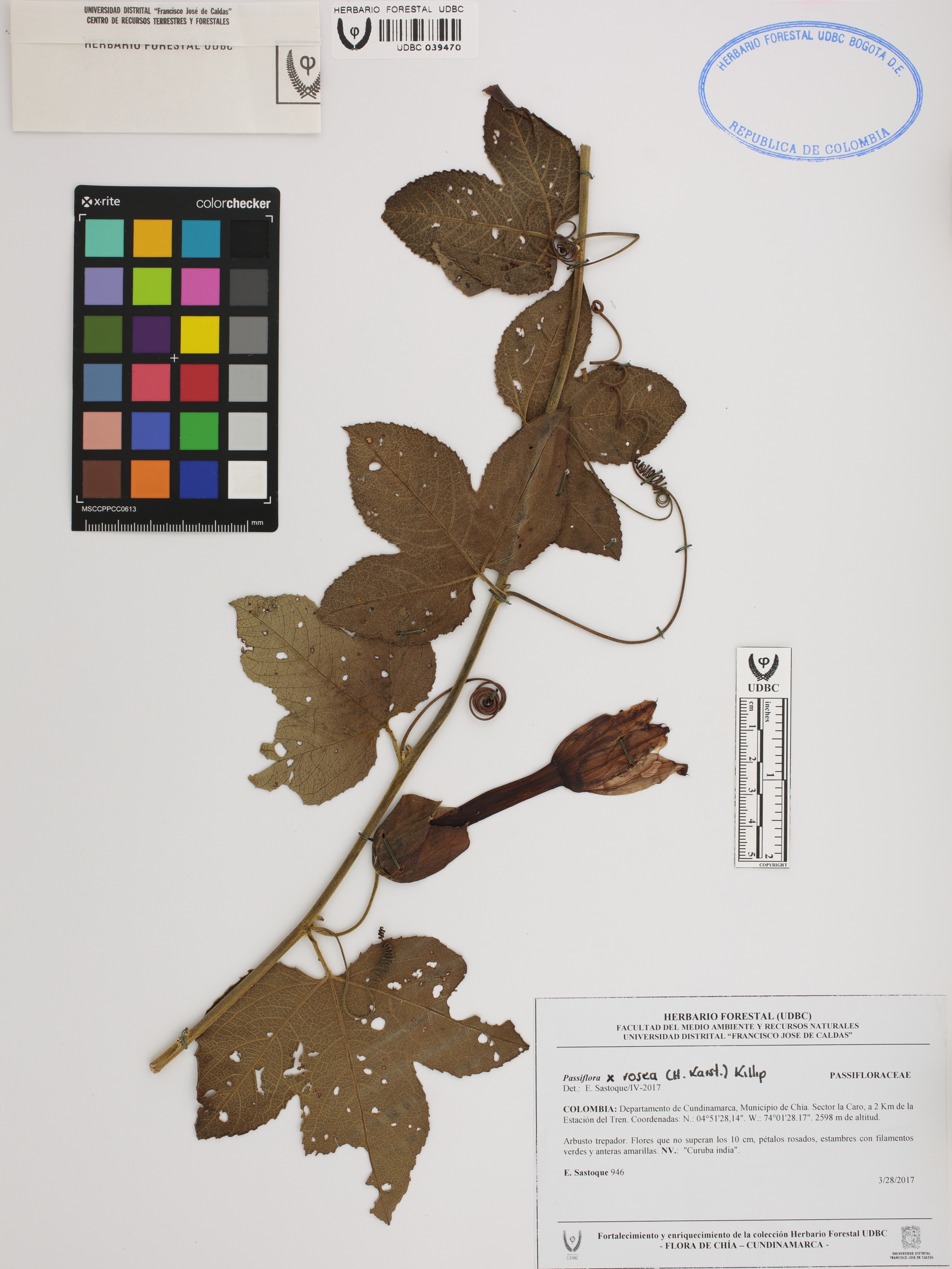 Fotografía del ejemplar Sastoque, E. 946, determinado como Passiflora × rosea en el año 2017