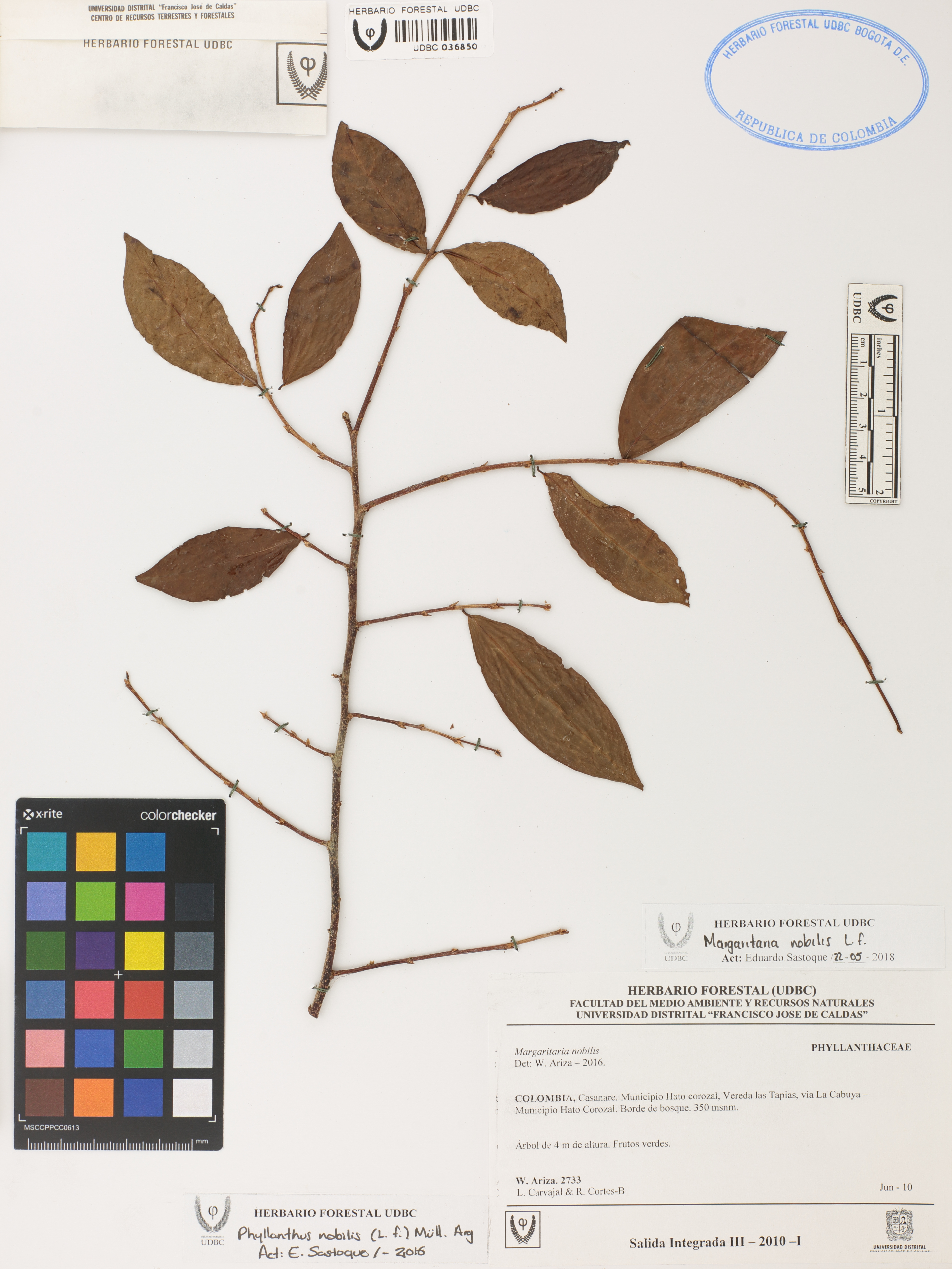 Fotografía del ejemplar Ariza, W. 2733, determinado como Margaritaria nobilis en el año 2016